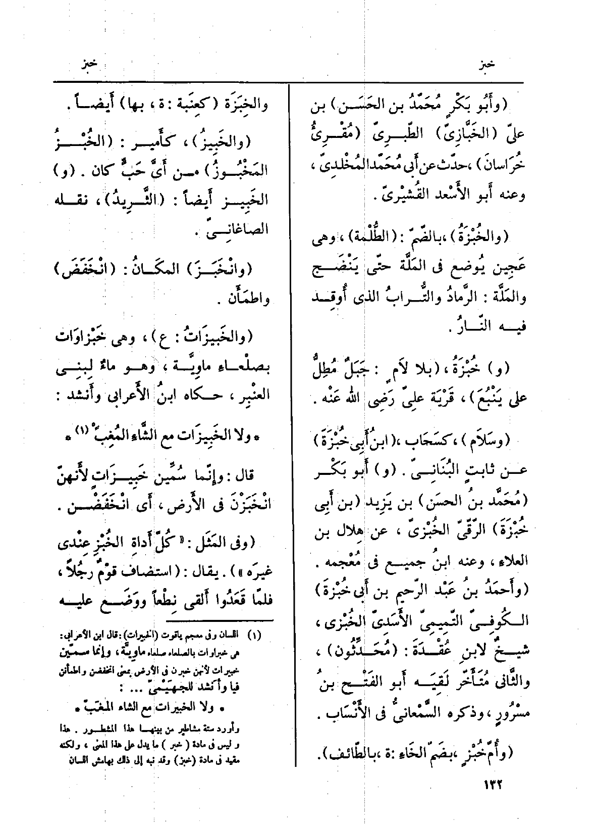 وانْخَبَزَ الْمَكَان: انْخفضَ واطْمأَنَّ. والخَبيزاتُ: ع، وَهِي خَبْزَاوات بصَلْعاءِ ماويّة، وَهُوَ ماءٌ لبني العَنبِر، حَكَاهُ ابْن الأَعْرابِيّ وَأنْشد: وَلَا الخَبيزاتُ مَعَ الشاءِ المُغِبّْ قَالَ: وإنّما سُمّين خَبيزاتٍ لأنهنّ انْخَبَزْنَ فِي الأَرْض، أَي انْخَفضْنَ. وَفِي المثَل: كلّ أداةِ الخُبْزِ عِنْدِي غيرَه. يُقَال: استضافَ قومٌ رجلا فلمّا قَعدوا ألْقى نِطْعاً وَوَضَع عَلَيْهِ