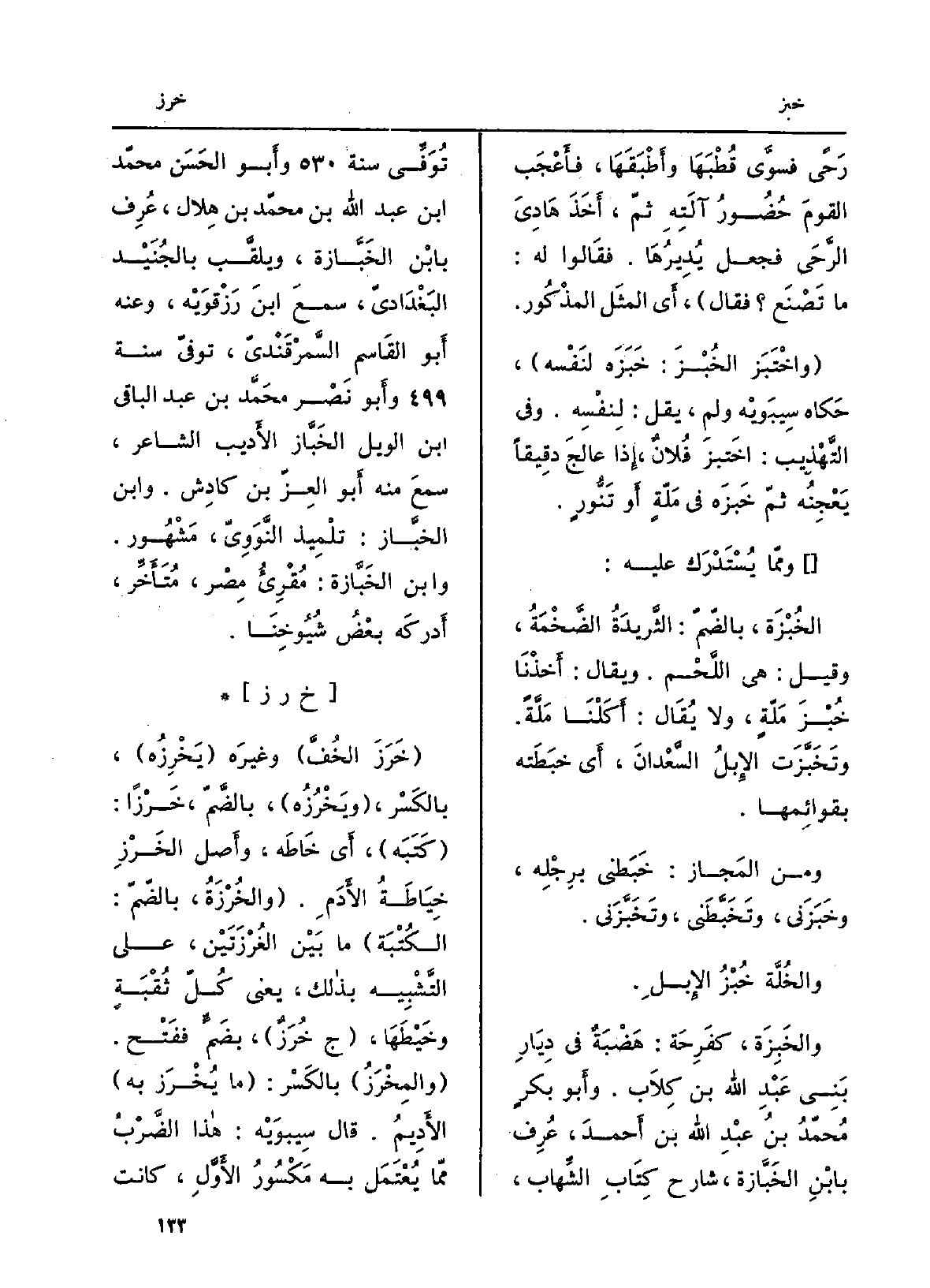 رحى فسوَّى قُطبَها وأَطبَقَها، فَأَعْجب القومَ حُضورُ آلتِه ثمّ أَخذ هادِيَ الرَّحى فَجعل يُديرُها. فَقَالُوا لَهُ: مَا تَصْنَع فَقَالَ، أَي المثَلَ المَذكور. واخْتَبزَ الخُبْزَ: خَبَزَه لنفْسِه، حَكَاهُ سِيبَوَيْهٍ، وَلم يقل: لنفْسِه. وَفِي التَّهْذِيب: اخْتَبزَ فلانٌ، إِذا عالجَ دَقيقاً يَعْجِنه ثمّ خَبَزَه فِي مَلّةٍ أَو تَنُّورٍ. ومِمّا يُسْتَدْرَك عَلَيْهِ: الخُبْزَة بالضمّ: الثَّريدةُ الضخمة. وَقيل: هِيَ اللَّحْم. وَيُقَال: أَخذنَا خُبْزَ مَلّةٍ، وَلَا يُقَال: أَكَلْنا مَلَّةً. وَتَخَبَّزْتُ الإبلُ السَّعْدانَ، أَي خَبَطَتْه بقوائِمها. منَ المَجاز: خَبَطَني برِجلِه، وَخَبَزَني، وَتَخَبَّطَني، وَتَخَبَّزَني. والخُلَّة خُبْزُ الإبلِ. والخَبِزَة، كفَرِحَة: هَضْبَةٌ فِي ديارِ بني عَبْد الله بن كلاب. وَأَبُو بكرٍ مُحَمَّد بن عَبْد الله بن أَحْمد، عُرِفَ بابنِ الخَبَّازة، شَارِح كتاب الشِّهاب، توفِّي سنة وَأَبُو الْحسن مُحَمَّد بن عَبْد الله بن مُحَمَّد بن هِلَال، عُرِفَ بِابْن الخَبّازة، ويُلقَّب بالجُنَيْد البغداديّ، سَمِعَ ابنَ رَزَقْوَيْه، وَعنهُ أَبُو الْقَاسِم السَّمَرْقَنْديّ، توفّي سنة وَأَبُو نصر مُحَمَّد)