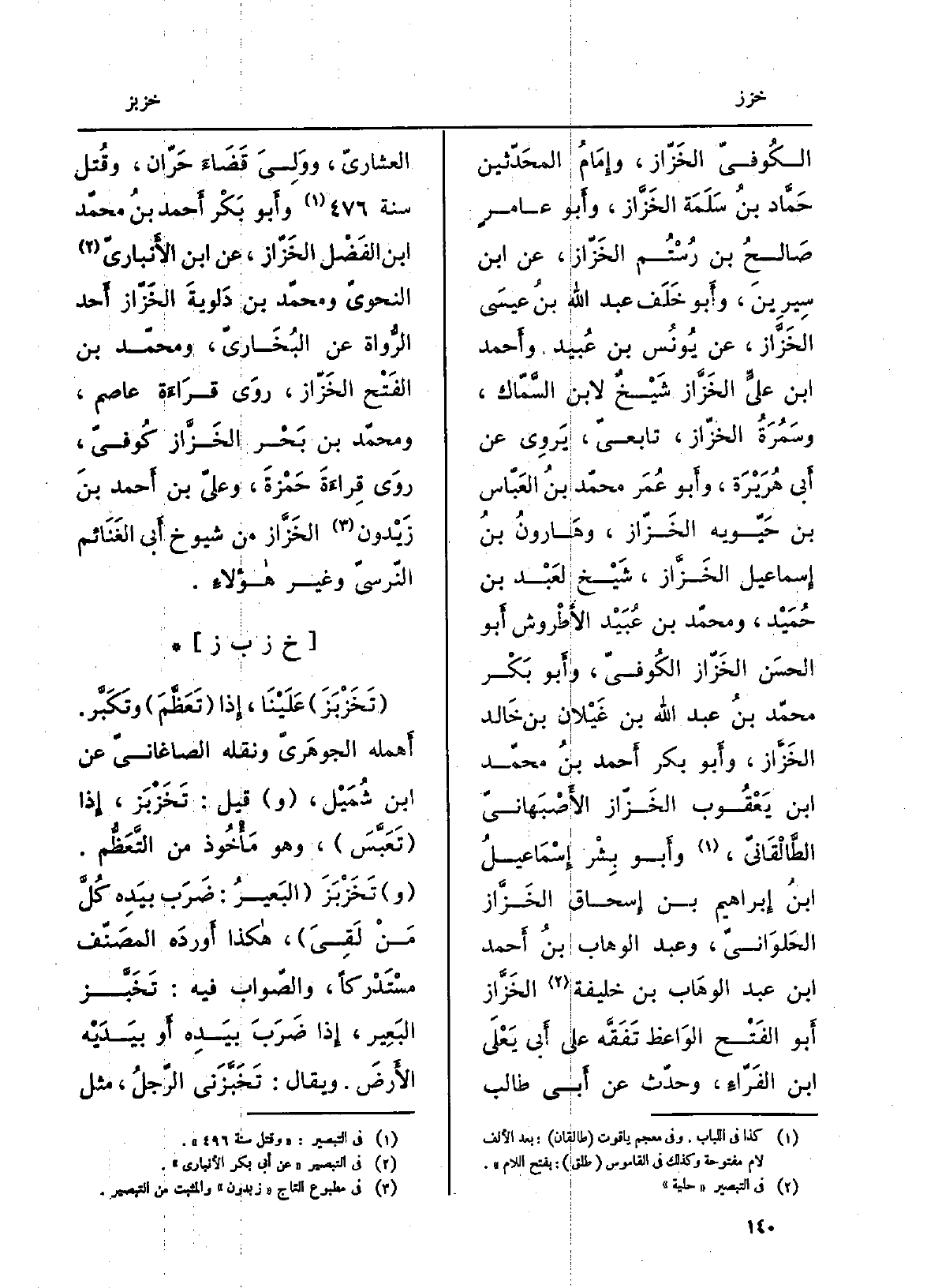 الكُوفيّ! الخَزَّاز، وإمامُ المحَدِّثين حَمَّاد بن سَلَمَة الخَزَّاز، وَأَبُو عامرٍ صالحُ بن رُستُم الخَزَّاز، عَن ابْن سِيرِين، وَأَبُو خلف عَبْد الله بنُ عِيسَى الخَزَّاز، عَن يُونُس بن عُبَيْد، وَأحمد بن عليٍّ الخَزَّاز شيخٌ لِابْنِ السَّمّاك، وسَمُرَةُ الخزّاز، تابعيّ، يَرْوِي عَن أبي هُرَيْرة، وَأَبُو عمر مُحَمَّد بن العبّاس بن حَيّويه الخَزَّاز، وهارونُ بنُ إِسْمَاعِيل الخَزَّاز، شيخٌ لعبد بن حُمَيْد، وَمُحَمّد بن عُبَيْد الأطْروش أَبُو الْحسن الخَزّاز الكُوفيّ، وَأَبُو بكر مُحَمَّد بن عَبْد الله بن غَيْلان بن خَالِد الخَزَّاز، وَأَبُو بكر أَحْمد بن مُحَمَّد بن يَعْقُوب الخَزَّاز الأَصْبَهانيّ الطَّالْقانيّ، وَأَبُو بِشْر إسماعيلُ بنُ إِبْرَاهِيم بن إِسْحَاق الخَزَّاز الحَلَوانيّ، وَعبد الْوَهَّاب بنُ أَحْمد بن عبد الْوَهَّاب بن خَليفَة الخَزَّاز أَبُو الْفَتْح الْوَاعِظ تفَقَّه على أبي يَعْلَى ابْن الفَرّاء، وحدَّثَ عَن أبي طَالب العشاريّ ووَلِيَ قَضاءَ حَرَّان، وقُتِلَ سنة وَأَبُو بكر أَحْمد بنُ مُحَمَّد بن الفَضْل الخَزَّاز، عَن ابْن الأَنْباريّ النحويّ وَمُحَمّد بن دَلويةَ الخَزّاز أحد الرُّواة عَن البُخاريّ، وَمُحَمّد بن الفَتح الخَزّاز، روى قراءةَ عَاصِم، وَمُحَمّد بن بَحْر الخَزَّاز كُوفيّ، روى قراءَةَ حَمْزَةَ، وعليّ بن احْمَد بن زَيْدُون الخَزَّاز من شُيُوخ أبي الغَنائمِ النَّرسيّ وَغير هَؤُلَاءِ.