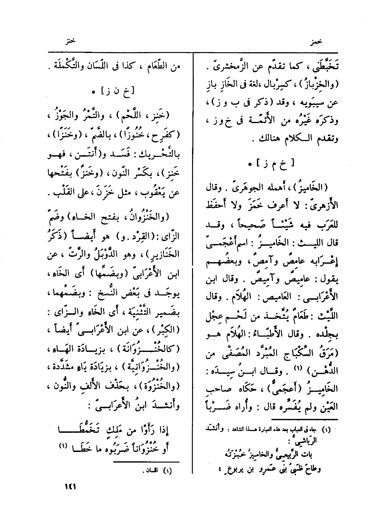 الخاميزُ، أهمله الجَوْهَرِيّ. وَقَالَ الأَزْهَرِيّ: لَا أعرف خَمَزَ وَلَا أحفظ للْعَرَب فِيهِ شَيْئا صَحِيحا، وَقد قَالَ اللَّيْث: الخاميزُ: اسمٌ أَعْجَميٌّ إعرابُه عامِصٌ وآمِصٌ، وبعضُهم يَقُول: عاميصٌ وآميصٌ. وَقَالَ اللِّسان: العاميص: الهُلام. وَقَالَ اللَّيْث: العاميص: طعامٌ يُتَّخذُ من لَحْمِ عِجل بجِلْده. وَقَالَ الأطِبَّاءُ: الهُلام هُوَ مَرَقُ السِّكْباج المُبرَّد المُصفَّى من الدُّهْن. وَقَالَ ابنُ سِيدَه: الخاميزُ أَعْجَميٌّ. حَكَاهُ صاحبُ العَين وَلم يُفسِّره قَالَ: وأُراه ضَرْبَاً من الطَّعَام، كَذَا فِي اللِّسان والتّكملة.