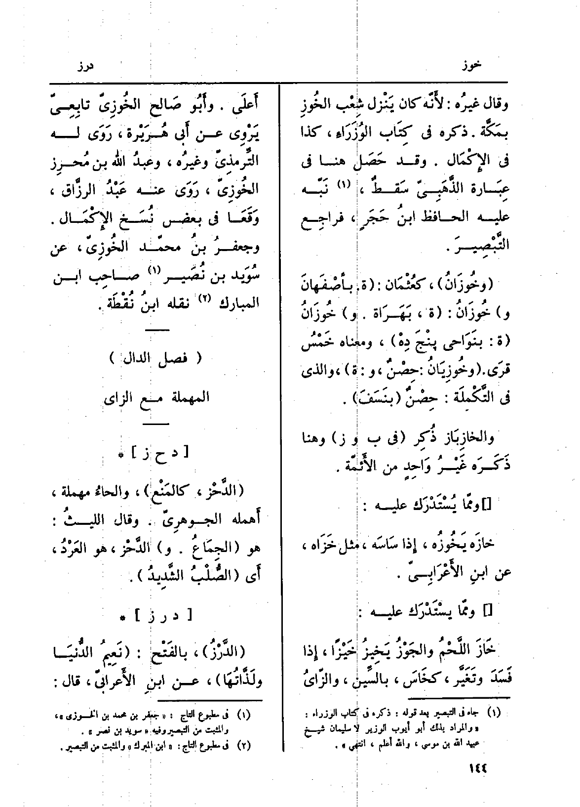 وَقَالَ غيرُه: لأنّه كَانَ ينزل شِعْب الخُوز بمكَّة. ذكره فِي كتاب الوزراء، كَذَا فِي الْإِكْمَال. وَقد حَصَلَ هُنَا فِي عِبارةِ الذَّهبيّ سَقطٌ، نبّه عَلَيْهِ الْحَافِظ ابنُ حَجَرٍ، فراجِع التَّبْصير. {وخُوزان، كعُثْمان: ة، بأَصْفَهان.} خُوزان: ة، بهَراة. وخُوزان: ة، بنواحي بنْجَ دِهْ، وَمَعْنَاهُ خَمْسُ قرى، {وخُوزِيَان: حِصنٌ، و: ة، وَالَّذِي فِي التكملة: حِصنٌ بنَسَف.} والخازِباز ذُكِرَ فِي بوز وَهنا ذَكَرَه غَيْرُ واحدٍ من الأئمّة. ومِمّا يُسْتَدْرَك عَلَيْهِ: {خازَه} يخوزُه، إِذا ساسَه، مثل خَزَاه، عَن ابْن الأَعْرابِيّ. ومِمّا يُسْتَدْرَك عَلَيْهِ: خازَ اللحمُ والجَوزُ {يَخْيِزُ} خَيْزَاً، إِذا فَسَدَ وتغَيَّرَ، كخاسَ، بالسِّين، والزايُ أَعْلَى، وَأَبُو صَالح الخُوزيّ تابعيّ يَرْوِي عَن أبي هُرَيْرة، روى لَهُ التِّرْمِذيّ وغيرُه، وعَبْد الله بن مُحْرِز الخُوزيّ، روى عَنهُ عبدُ الرزّاق، وَقَعَا فِي بعض نسخ الإكْمال. وجعفرُ بنُ مُحَمَّد! - الخُوزيّ، عَن سُوَيْد بن نُصَيْر صاحبِ ابْن المبارَك نَقله ابنُ نُقطَة.)