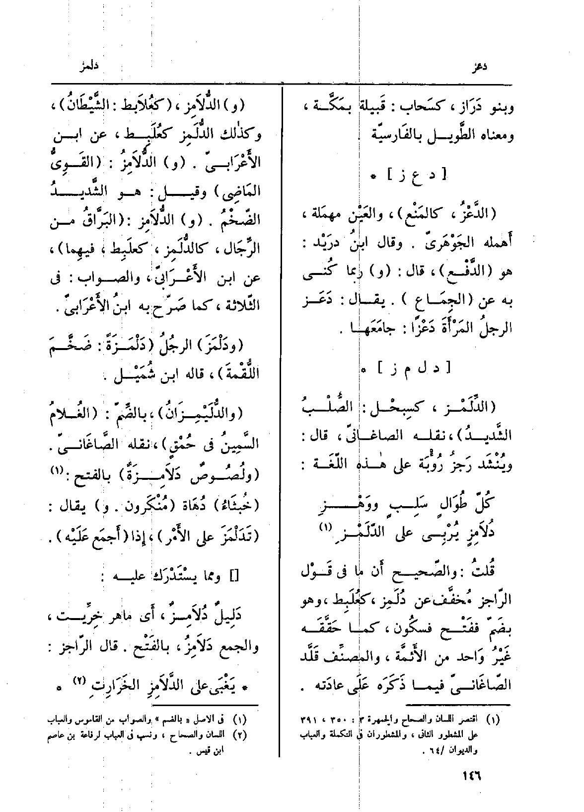 قلتُ: وَالصَّحِيح أَن مَا فِي قَوْلِ الرّاجزِ مُخفَّف عَن دُلَمِز، كعُلَبِط، وَهُوَ بضمّ ففَتح فَسُكُون، كَمَا حقَّقَه غيرُ واحدٍ من الأئمّة، والمُصَنِّف قلَّد الصَّاغانِيّ فِيمَا ذَكَرَه على عَادَته. الدُّلامِز، كعُلابِط: الشَّيْطان وَكَذَلِكَ الدُّلَمِز كعُلَبِط، عَن ابْن الأَعْرابِيّ. الدُّلامِز: القَويُّ الْمَاضِي، وَقيل: هُوَ الشديدُ الضخمُ. الدُّلامِز: البَرَّاق من الرِّجال، كالدُّلَمِز، كعُلَبِط، فيهمَا، عَن ابْن الأَعْرابِيّ، وَالصَّوَاب: فِي الثَّلَاثَة، كَمَا صرَّح بِهِ ابْن الأَعْرابِيّ. ودَلْمَزَ الرجلُ دَلْمَزَةً: ضَخَّمَ اللُّقْمَةَ، قَالَه ابْن شُمَيْل.