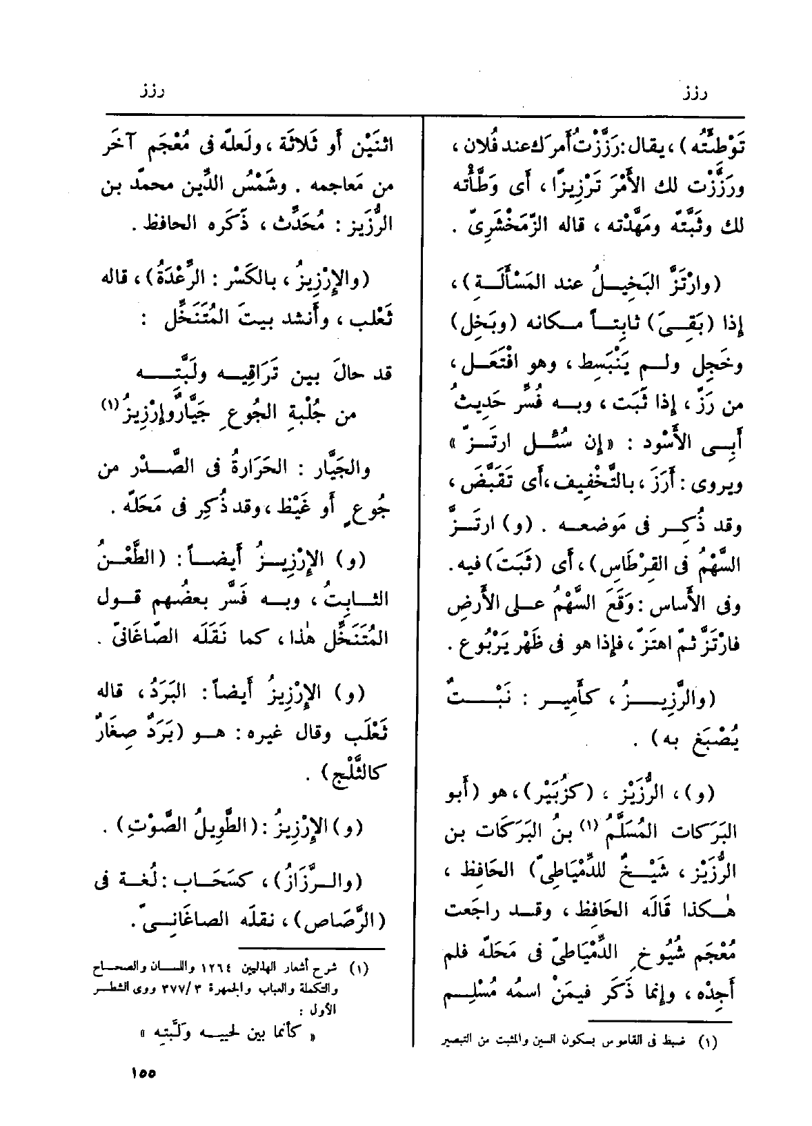 تَوْطِئَتُه، يُقَال: {رَزَّزْتُ أَمرَكَ عندَ فلَان،} ورَزَّزْت لكَ الأَمرَ تَرْزِيزاً، أَي وَطَّأْتُه لَك وثَبَّتّه ومَهَّدْته، قَالَ الزَّمَخْشَرِيّ. {وارْتَزَّ الْبَخِيل عِنْد المَسْأَلة، إِذا بَقِي ثَابتا مَكَانَهُ وبَخِلَ وَلم يَنْبَسِط، وَهُوَ افْتَعَل، من رَزَّ، إِذا ثَبَت، وَبِه فُسِّر حَدِيث أَبي الأَسود: إِن سُئِلَ} ارْتَزَّ. ويُروَى: أَرَزَ، بالتَّخفيف، أَي تقَبَّضَ، وَقد ذُكر فِي مَوْضِعه. ارْتَزَّ السَّهْمُ فِي القِرطاسِ، أَي ثَبت فِيهِ. وَفِي الأَساس: وقعَ السهمُ على الأَرضِ فارْتَزَّ ثمَّ اهْتَزَّ، فَإِذا هُوَ فِي ظَهر يَرْبُوع. {والرَّزيزُ، كأَمير: نَبْتٌ يُصبَغ بِهِ.} الرُّزَيْز، كزُبَيْر، هُوَ أَبو البَرَكات المُسَلَّمُ بنُ البركات بن الرُّزَيْز، شيخٌ للدِّمياطيّ الْحَافِظ، هَكَذَا قَالَه الْحَافِظ، وَقد راجعتُ مُعظم شُيُوخ الدِّمياطِيّ فِي محلِّه فَلم أَجِدْه، وإنّما ذكر فِيمَن اسمُه مُسْلِم اثْنَيْنِ أَو ثَلَاثَة، ولعلَّه فِي مُعجَم آخر من مَعاجمه. وشمس الدِّين مُحَمَّد بن الرُّزَيْز: مُحَدِّث، ذكره الْحَافِظ. {والإرْزِيزُ بالكَسْرَة: الرَّعْدَةُ، قَالَه ثَعلب، وأَنشدَ بيتَ المُتَنَخِّل: