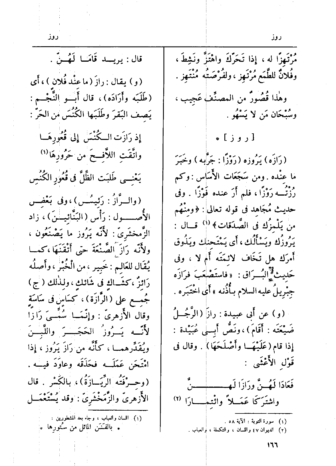 قَالَ: يُرِيد قاما لهنَّ. يُقَال: رازَ مَا عِنْد فلَان، أَي طَلَبَه وأَرَاَده، قَالَ أَبُو النَّجم يصفُ البقرَ وطَلَبَها الكُنُسَ من الحَرّ: