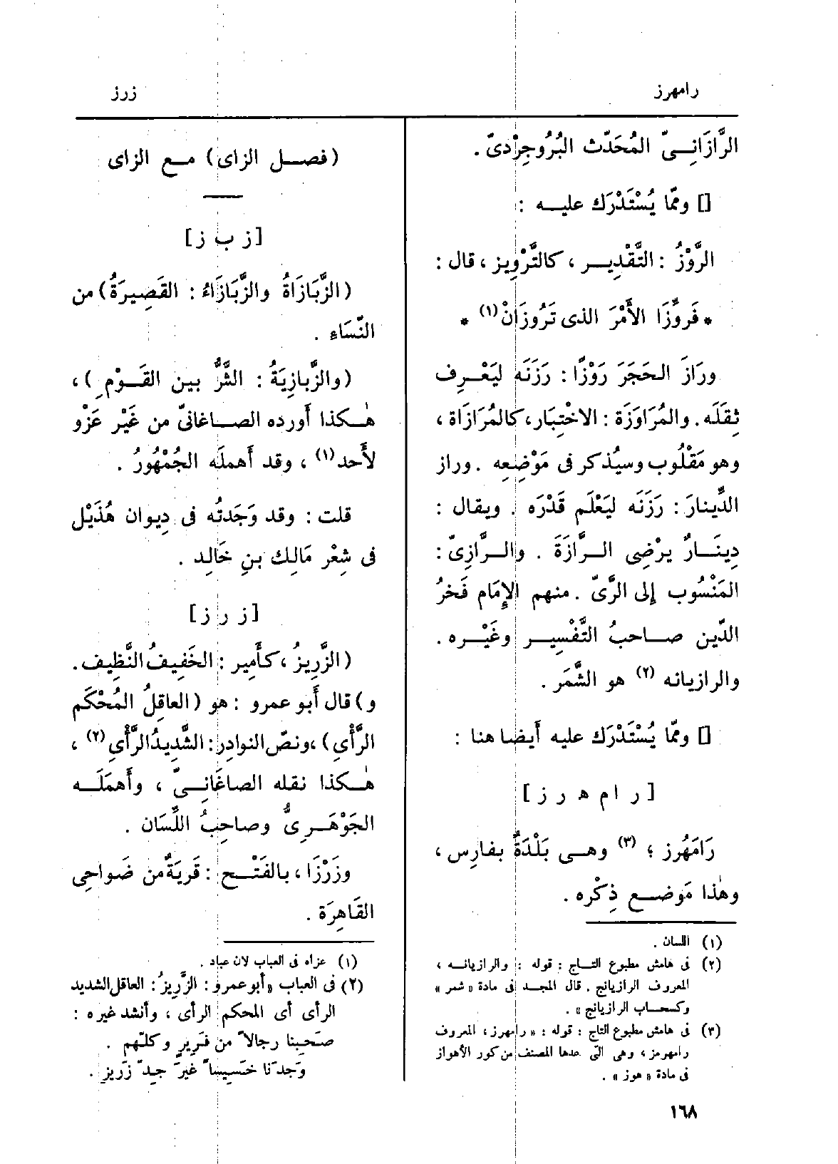 {الرَّازانِيّ المُحدِّث البُرُوجِرْدِيّ. ومِمّا يُسْتَدْرَك عَلَيْهِ:} الرَّوْز: التَّقدير، {كالتَّرْوِيز، قَالَ:} فرَوِّزا الأمرَ الَّذِي {تَروزانْ} ورازَ الحجرَ {رَوْزَاً:} رَزَنَه ليعرِف ثِقَلَه. {والمُراوَزَة: الاخْتِبار،} كالمُرازاة، وَهُوَ مقلوب وَسَيذكر فِي مَوْضِعه. وراز الدِّينار: وَزَنَه ليعلمَ قَدْرَه. وَيُقَال: دينارٌ يُرْضِي الرَّازَةَ. {- والرَّازِيّ: المَنسوبُ إِلَى الرَّيّ. مِنْهُم الإِمَام فَخْرُ الدّين صَاحب التَّفْسِير وَغَيره.} والرازيانه هُوَ الشَّمَر. ومِمّا يُسْتَدْرَك عَلَيْهِ: أَيْضا هُنَا: