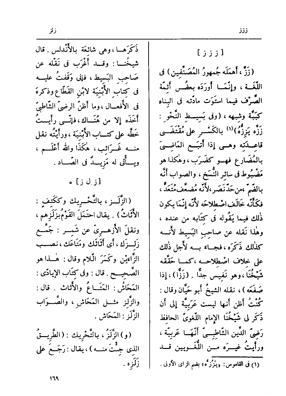 {زَزَّ، أهمله جمهورُ المُصَنِّفين فِي اللُّغَة، وإنّما أَوْرَده بعضُ أئمّة الصَّرْف فِيمَا اسْتَوَت مادّته فِي البِناءِ كبَبَّة وشِبْهه، وَفِي بسيط النَّحْوِ:} زَزَّه {يزِزُّه بِالْكَسْرِ على مُقتَضى قاعدَتِه وَهِي إِذا أَتْبَع الماضيَ بالمضارِع فَهُوَ كَضَرَب، وَهَكَذَا هُوَ مَضْبُوط فِي سَائِر النُّسَخ، والصوابُ أنّه بالضمّ، من حدِّ نَصَر، لأنّه مُضعَّف مُتَعَدٍّ، فكأنّه خالَفَ اصْطِلاحَه لأنّه إنّما يكون ذَلِك فِيمَا يَقُوله فِي كِتَابه من عِنْده، وَهَذَا نَقله عَن صاحبِ البَسيط لأنّه كَذَلِك ذَكَرَه، فجَاء بِهِ لأجلِ ذَلِك على خلافِ اصْطِلاحِه، كَمَا حقَّقَه شَيْخُنا، وَهُوَ نَفيسٌ جدا.} زَزَّاً، إِذا صَفَعَه، نَقله الشيخُ أَبُو حَيَّان وَقَالَ: كنتُ أظنّ أَنَّهَا لَيست عربيّة إِلَى أَن ذَكَرَ لي شَيْخُنا الإمامُ اللّغويّ الْحَافِظ رَضِيّ الدِّين الشاطِبِيّ أنّها عربيّة، ورأيتُ غيرَه من اللُّغَويِّين قد ذَكَرَها، وَهِي شائعةٌ بالأندلس. قَالَ شَيْخُنا: وَقد أَغْرَب فِي نَقْلِه عَن صَاحب الْبَسِيط، فَإِنِّي وَقَفْتُ عَلَيْهِ فِي كتاب الأَبْنِيَة لابنِ القَطَّاع وَذَكَره فِي الْأَفْعَال، وَمَا أظنّ الرضيّ الشّاطبيّ أَخَذَه إِلَّا من هُنَاكَ، فإنّي رأيتُ خَطَّه على كتاب الْأَبْنِيَة، ورأيتُه نقل مِنْهُ غَرائب، هَكَذَا وَالله أَعْلَم، وَيَأْتِي لَهُ مَزيدٌ فِي الصّاد.