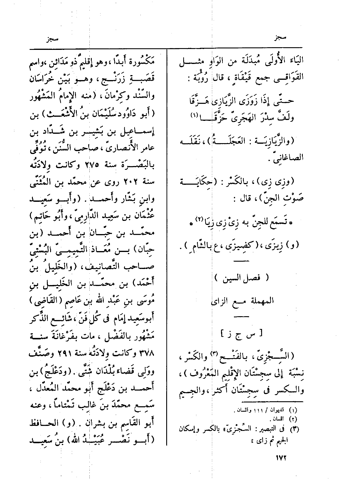 السَّجْزِيّ، بِالْفَتْح والكسْر، نِسبة إِلَى سِجِسْتان الإقليم المَعروف، والكسْر فِي سِجِستان أَكثر، وَالْجِيم مَكسورَة أَبداً، وَهُوَ إقليمٌ ذُو مَدَائِن، وَاسم قَصَبَة زَرَنْج، وَهُوَ بَين خُراسان والسّند وكِرمان، مِنْهُ الإِمَام المَشهور أَبو دَاوُود سُليمان بن الأَشعث بن إِسْمَاعِيل بن بشير بن شدّاد بن عَامر الأَنصاريّ، صَاحب السُّنن، توفّي بِالْبَصْرَةِ سنة وَكَانَت وِلَادَته سنة روى عَن مُحَمَّد بن المثنّى وَابْن بشّار وأَحمد. وأَبو سعيد عُثْمَان بن سعيد الدَّارِمِيّ، وأَبو حَاتِم مُحَمَّد بن حِبّان بن أَحمد بن حِبَّان بن مُعاذ التَّميميّ البسْتِيّ صَاحب التَّصانيف، والخليل بن أَحمد بن مُحَمَّد بن الْخَلِيل بن مُوسَى بن عبد الله بن عَاصِم القَاضِي أَبو سعيد إِمَام فِي كلِّ فَنّ، شَائِع الذِّكر مَشْهُور بالفضْل، مَاتَ بفَرْغانة سنة وَكَانَت وِلادته سنة وصَنَّف ووَلِيَ قضاءَ بلدان شتَّى. ودَعْلَجُ بنُ أَحمد بن دَعْلَج أَبو مُحَمَّد المُعدّل، سَمع مُحَمَّد بن غَالب تَمْتاماً، وَعنهُ أَبو الْقَاسِم بن بَشرَان. والحافظ أَبو نصر عُبيد الله بنُ سعيد