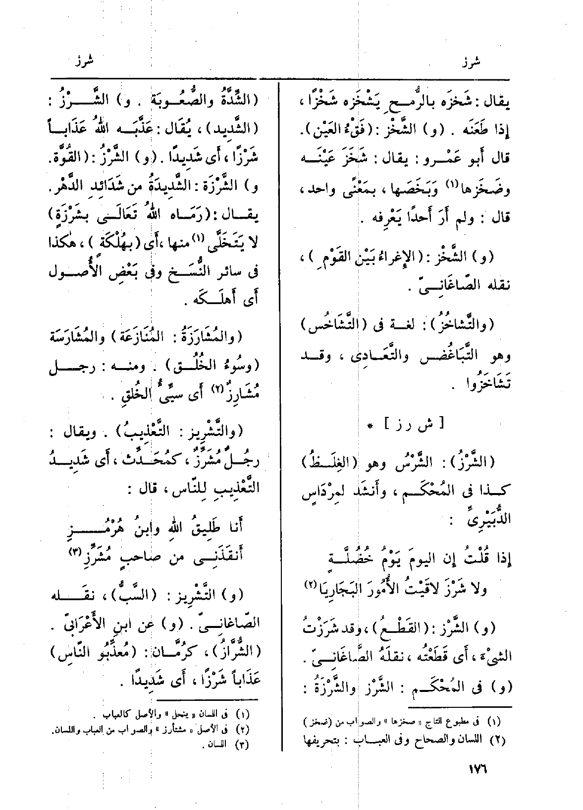 التَّشْريز: السَّبُّ، نَقله الصَّاغانِيّ. عَن ابْن الأَعرابيّ. الشُّرَّازُ، كرُمّان: مُعَذِّبو النّاس عذَابا شَرْزاً، أَي شَدِيدا.