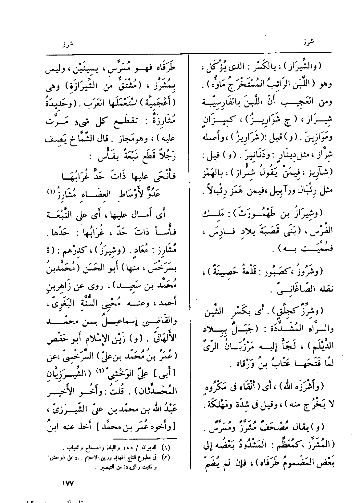 والشِّيراز، بالكّسْر: الَّذِي يُؤكَل، وَهُوَ اللّبَن الرَّائبُ المَسْتَخرَجُ ماؤُه. وَمن العجيب أَنَّ اللّبَن بالفارسيَّة شِيراز، ج شَوارِيزُ، كمِيزانٍ ومَوازِينَ. قيل: شَرارِيزُ، وأَصلُه شِرَّاز، مثل دِينارٍ: ودَنانِيرَ. قيل: شَآرِيز، فِيمَن يَقُول شِئْرَاز، بالهَمز مثل رِئْبال ورآبيل، فِيمَن همَز رِئبالاً. وشِيرازُ بنُ طَهْمُورَثَ: ملِك الفُرْس، بنى قصبةَ بلادِ فارِسَ، فسُمِّيَت بِهِ. وشَرُوزُ، كصَبور: قلعةٌ حصينةٌ، نَقله الصَّاغانِيّ. وشِرِّزٌ كجِلِّقٍ. أَي بكسْر الشِّين والرَّاء المُشَدَّدة: جبَلٌ بِبِلَاد الدَيْلَم، لجَأَ إِلَيْهِ مَرْزُبانُ الرّيّ لمّا فتحَها عَتّابُ بنُ وَرْقاءَ. وأَشْرَزَه الله، أَي أَلقاه فِي مَكْروهٍ لَا يخرج مِنْهُ، وَقيل فِي شِدّة ومَهْلَكَة. يُقَال مُصْحَفٌ مُشَرَّزٌ ومُسَرَّسٌ. المُشَرَّز، كمُعَظَّم: المَشدودُ بعضُه إِلَى بعض المَضْمومُ طَرَفاه، فَإِن لم يُضَمّ طَرَفاه فَهُوَ مُسَرَّس، بسينَيْن، وَلَيْسَ بمُشَرَّز، مُشتَقٌّ من الشِّيرازَة وَهِي أَعجميَّة استعملَها العَرب، وحديدةٌ مُشارِزَةٌ: تقطَعُ كُلَّ شيءٍ مرَّت عَلَيْهِ، وَهُوَ مَجاز. قَالَ الشَمّاخ يصف رَجُلاً قَطَعَ نَبْعَةً بفَأْس: