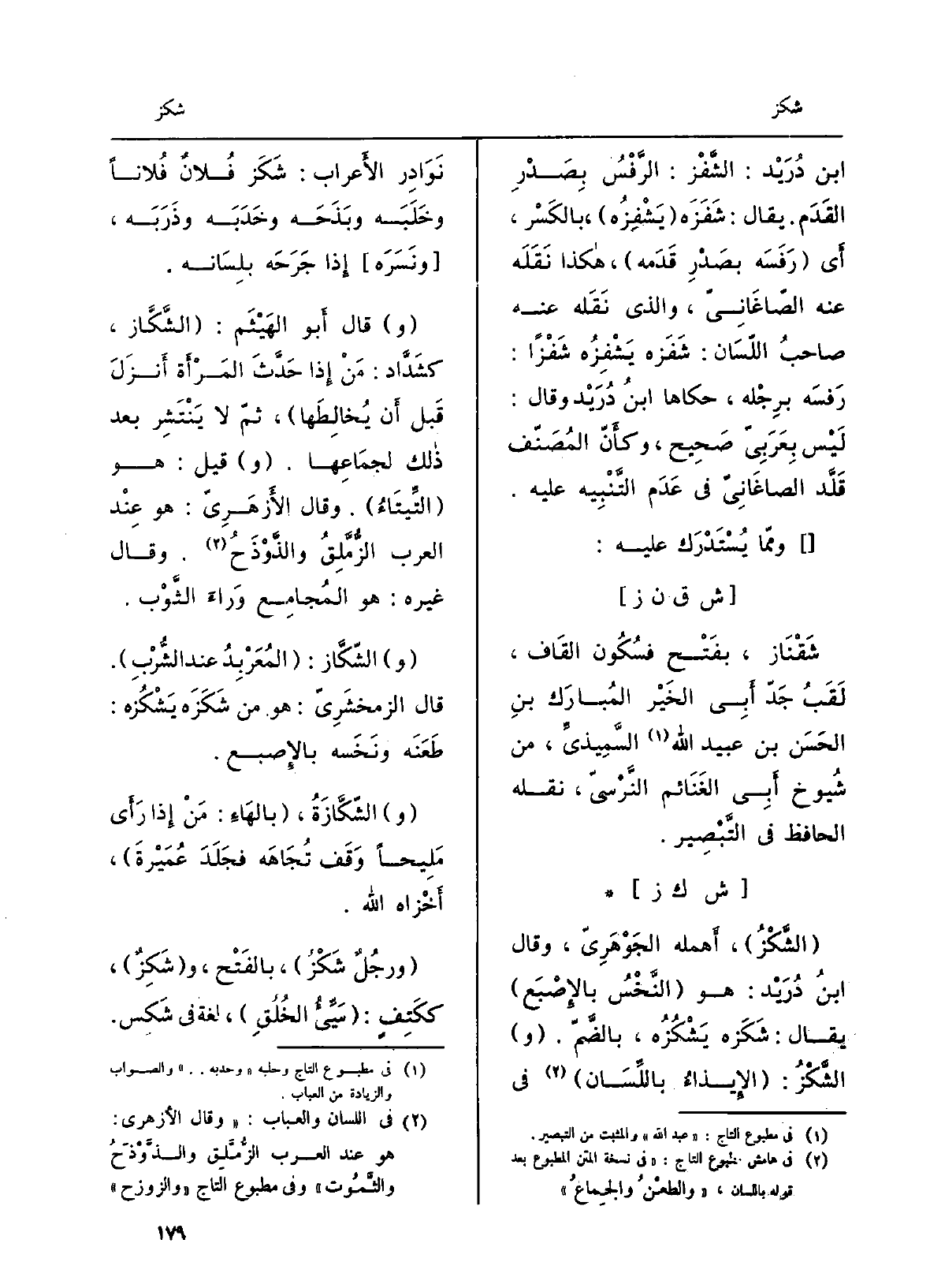 الشَّكْزُ: الإيذاءُ بِاللِّسَانِ فِي نَوادِر الأَعراب: شَكَزَ فلانٌ فلَانا وخَلَبَه وبَذَحَه وخَدَبَه وذَرَبَه، ونسَرَه إِذا جرَحَه بلسانِه. قَالَ أَبو الْهَيْثَم: الشَّكَّاز، كشَدَّاد: مَن إِذا حَدَّثَ المَرأَة أَنزَل قبل أَن يُخالِطَها، ثمَّ لَا ينتشر بعد ذَلِك لِجمَاعِها. قيل: هُوَ التِّيتاءُ. وَقَالَ الأَزْهَرِيّ: هُوَ عِنْد الْعَرَب الزُّمَّلِقُ والذَّوْذَحُ. وَقَالَ غيرُه: هُوَ المُجامِع وراءَ الثَّوب. الشَّكَّاز: المُعَرْبِدُ عِنْد الشُّرْبِ. قَالَ الزَّمخشريّ: هُوَ من شَكَزَه يَشْكُزُه: طعنَه ونَخَسه بالإصبع. الشَّكَّازَةُ: بالهاءِ: مَن إِذا رأَى مَليحاً وقفَ تُجاهَه فجلَدَ عُمَيْرَةَ، أَخزاه الله. ورجُلٌ شَكْزٌ، بِالْفَتْح، وشَكِزٌ، ككَتِفٍ: سيِّءُ الخُلُقِ، لُغَة فِي شَكِسَ.