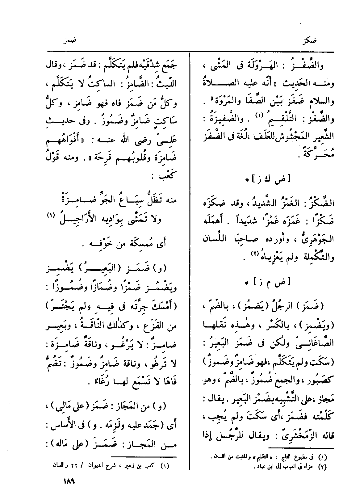 أَي مُمسِكَه من خَوْفِه. ضَمَزَ البعيرُ يَضْمِز ويَضْمُز ضَمْزَاً وضُمازاً وضُموزاً: أمسكَ جِرَّتَه فِي فِيهِ وَلم يجتَرَّ من الفَزَع، وَكَذَلِكَ النَّاقة، وبعير ضامِزَةٌ: لَا يَرْغُو، وناقةٌ ضامِزَة: لَا تَرْغُو، وناقةٌ ضامِزٌ وضَمُوزٌ: تَضُمُّ فاها لَا تَسْمَع لَهَا رُغاءً. منَ المَجاز: ضَمَزَ على مَالِي، أَي جَمَدَ عَلَيْهِ ولَزِمَه. وَفِي الأساس: منَ المَجاز: ضَمَزَ على مَاله: