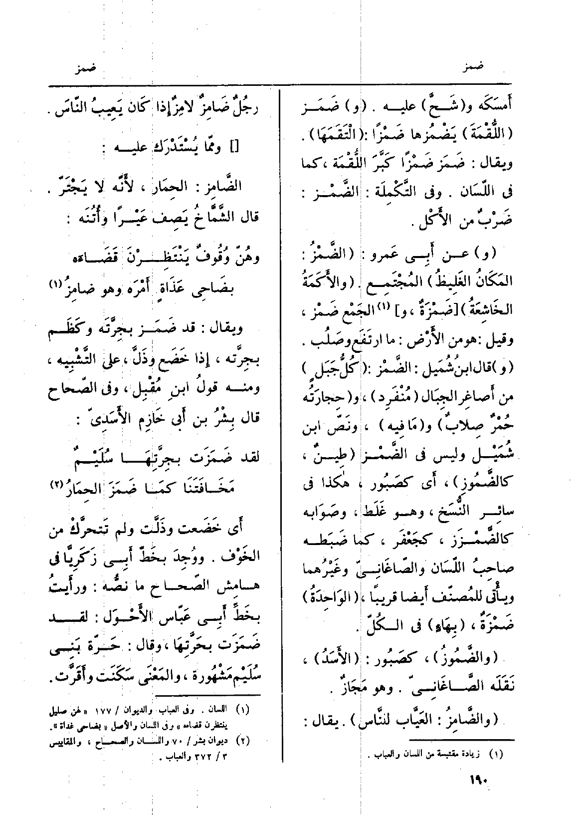 جبَلٍ من أصاغرِ الْجبَال مُنفرِد، وحجارتُه حُمرٌ صِلابٌ وَمَا فِيهِ، ونَصّ ابْن شُمَيْل وَلَيْسَ فِي الضَّمْز طِينٌ، كالضَّمُوزِ، أَي كصَبُور، هَكَذَا فِي سَائِر النُّسَخ، وَهُوَ غَلَط، وصوابُه كالضَّمْزَز، كَجَعْفر، كَمَا ضَبطه صاحبُ اللِّسان والصَّاغانِيّ وغيرُهما وَيَأْتِي للمُصنِّف أَيْضا قَرِيبا، الواحدةُ ضَمْزَةٌ، بهاءٍ فِي الكلّ. والضَّمُوز، كصَبور: الأسَد، نَقله الصَّاغانِيّ. وَهُوَ مَجاز. والضَّامِز: العَيَّابُ للنَّاس. يُقَال: رجلٌ ضامِزٌ لامِزٌ إِذا كَانَ يَعيبُ الناسَ. ومِمّا يُسْتَدْرَك عَلَيْهِ: الضَّامِز: الحِمار، لأنّه لَا يَجْتَرّ. قَالَ الشَّمَّاخ يَصِفُ عَيْرَاً وأُتُنَه: