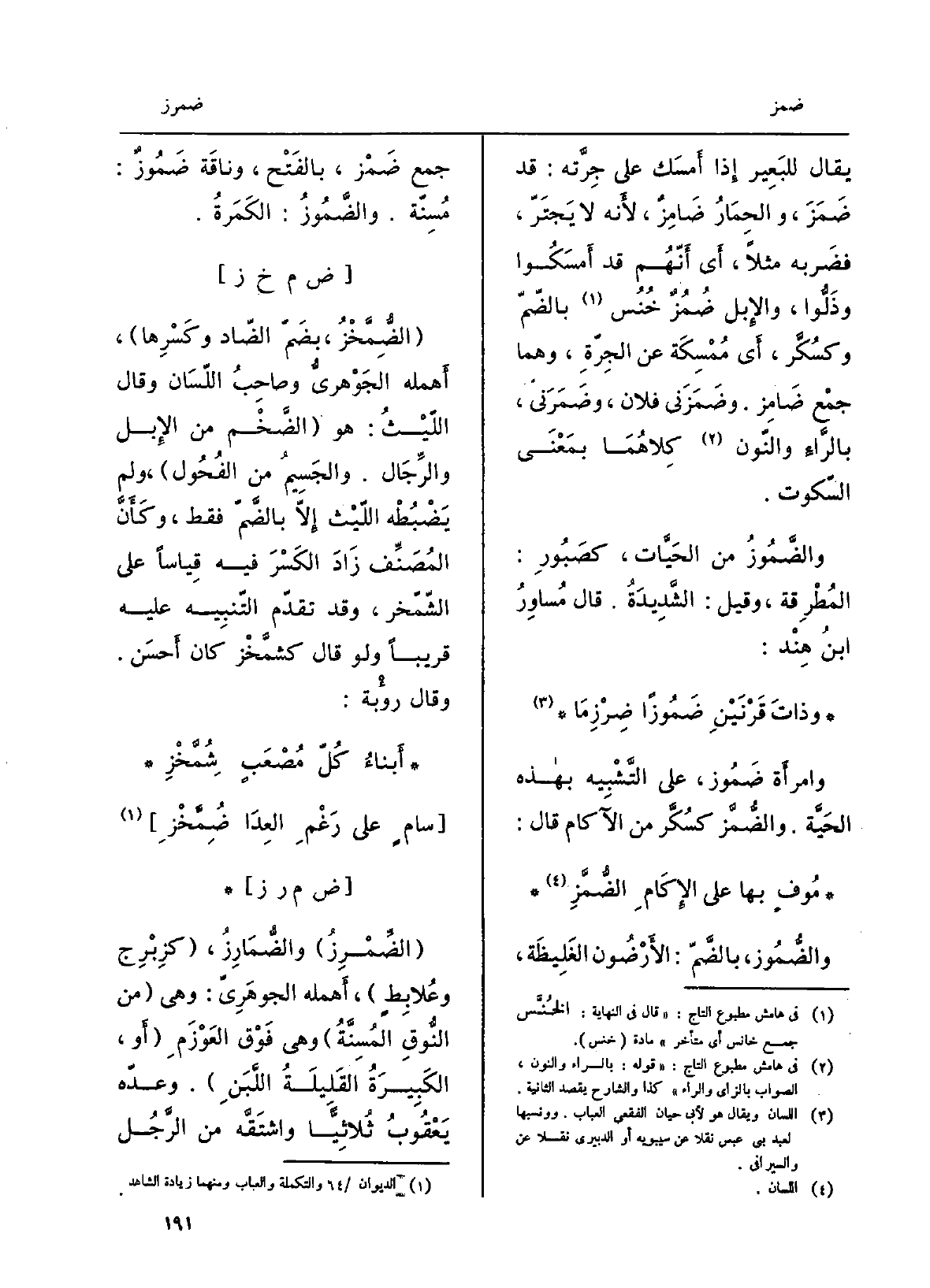 يُقَال للبعير إِذا أمسكَ على جِرَّته: قد ضَمَزَ، والحِمارُ ضامِزٌ، لأنّه لَا يَجْتَرّ، فَضَربهُ مثلا، أَي أَنهم قد أَمْسَكوا وذَلُّوا، والإبلُ ضُمُزٌ خُنُس بالضمّ وكُسَكَّر، أَي مُمسِكَة عَن الجِرَّة، وهما بالراء وَالنُّون كلاهُما بِمَعْنى السّكوت. والضُّموزُ من الحَيَّات، كصَبُور: المُطرِقة، وَقيل: الشَّدِيدَة. قَالَ مُساوِرُ بنُ هِند: وذاتَ قَرْنَينِ ضَمُوزاً ضِرْزِما وامرأةٌ ضَمُوز، على التَّشْبِيه بِهَذِهِ الحيّة. والضُّمَّز كسُكَّر من الآكام قَالَ: مُوفٍ بهَا على الإكامِ الضُّمَّزِ والضُّمُوز، بالضمّ: الأَرْضون الغليظة، جمع ضَمْز، بالفَتْح، وناقة ضَمُوزٌ: مُسِنّة. والضَّمُوز: الكَمَرَة. (