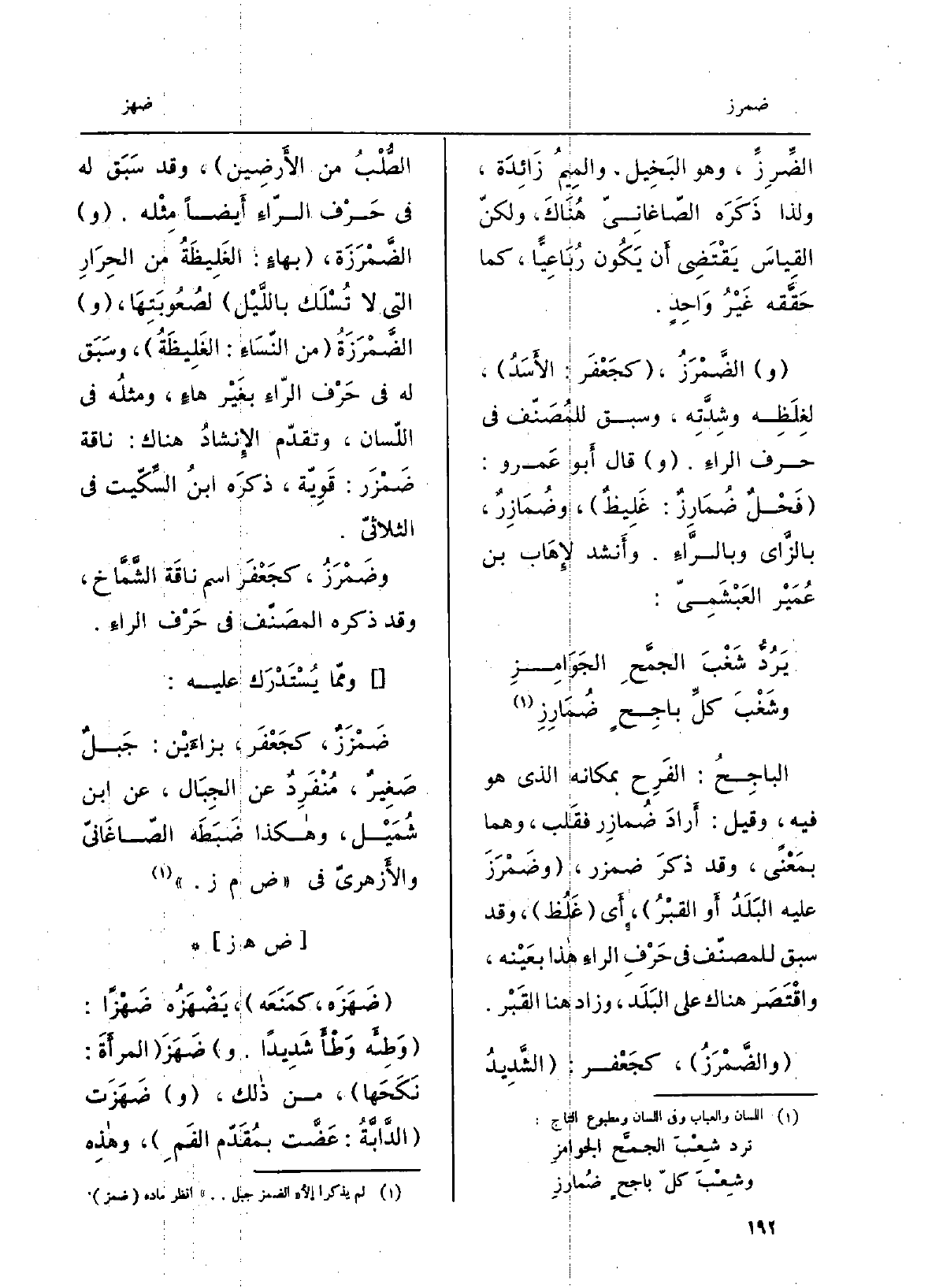 الضَّرِزِّ، وَهُوَ الْبَخِيل، والميمُ زَائِدَة، وَلذَا ذَكَرَه الصَّاغانِيّ هُنَاكَ، ولكنّ القياسَ يَقْتَضِي أَن يكون رُباعيّاً، كَمَا حقَّقه غَيْرُ واحدٍ. الضَّمْرَز، كَجَعْفَر: الأَسَد، لغِلَظِه وِدَّته، وَسبق للمُصنِّف فِي حرف الرَّاء. قَالَ أَبُو عَمْرو: فَحلٌ ضُمارِزٌ: غليظٌ، وضُمارِزٌ، بالزاي وبالراء. وَأنْشد لإهاب بن عُمَيْر العَبْشَميّ: