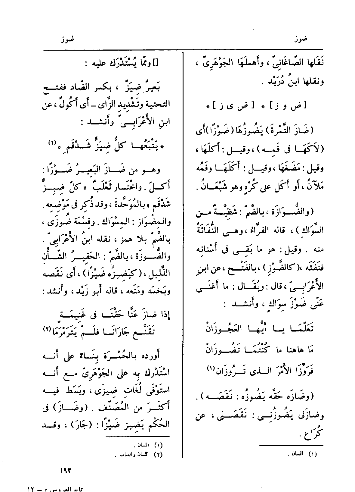 أوردهُ بالحُمْرة بِنَاء على أنّه استدركَ بِهِ على الجَوْهَرِيّ مَعَ أَنه استوفى لغاتِ} ضِيزى، وَبَسَط فِيهِ أَكثر من المُصَنِّف. {وضازَ فِي الحُكْم} يَضيزُ! ضَيْزَاً: جارَ، وَقد