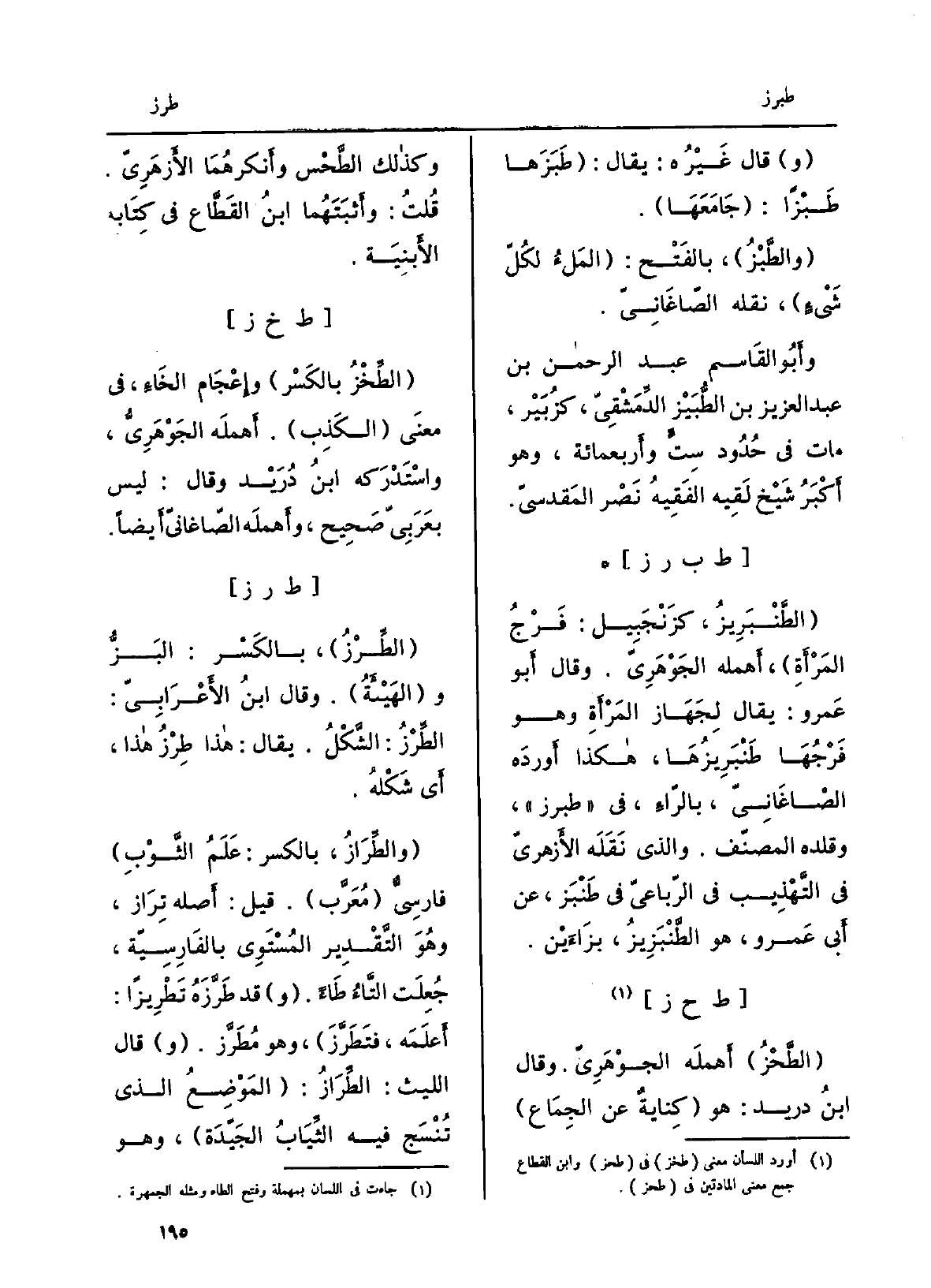 الطِّرْز، بِالْكَسْرِ: البَزُّ والهَيْئة. وَقَالَ ابْن الأَعْرابِيّ: الطِّرْزُ: الشَّكل. يُقَال: هَذَا طِرْزُ هَذَا، أَي شَكْلُه. والطِّراز، بِالْكَسْرِ: عَلَمُ الثَّوبِ، فارسيٌّ مُعرَّب. قيل: أَصله تِراز، وَهُوَ التَّقْدِير المُستوي بالفارسيّة، جُعِلَت التاءُ طاءً. قد طَرَّزَه تَطْرِيزاً: أعلمهُ، فَتَطَرَّزَ، وَهُوَ مُطَرَّز. قَالَ اللَّيْث: الطِّراز: المَوضِعُ الَّذِي تُنسَج فِيهِ الثِّيَاب الجيِّدة، وَهُوَ