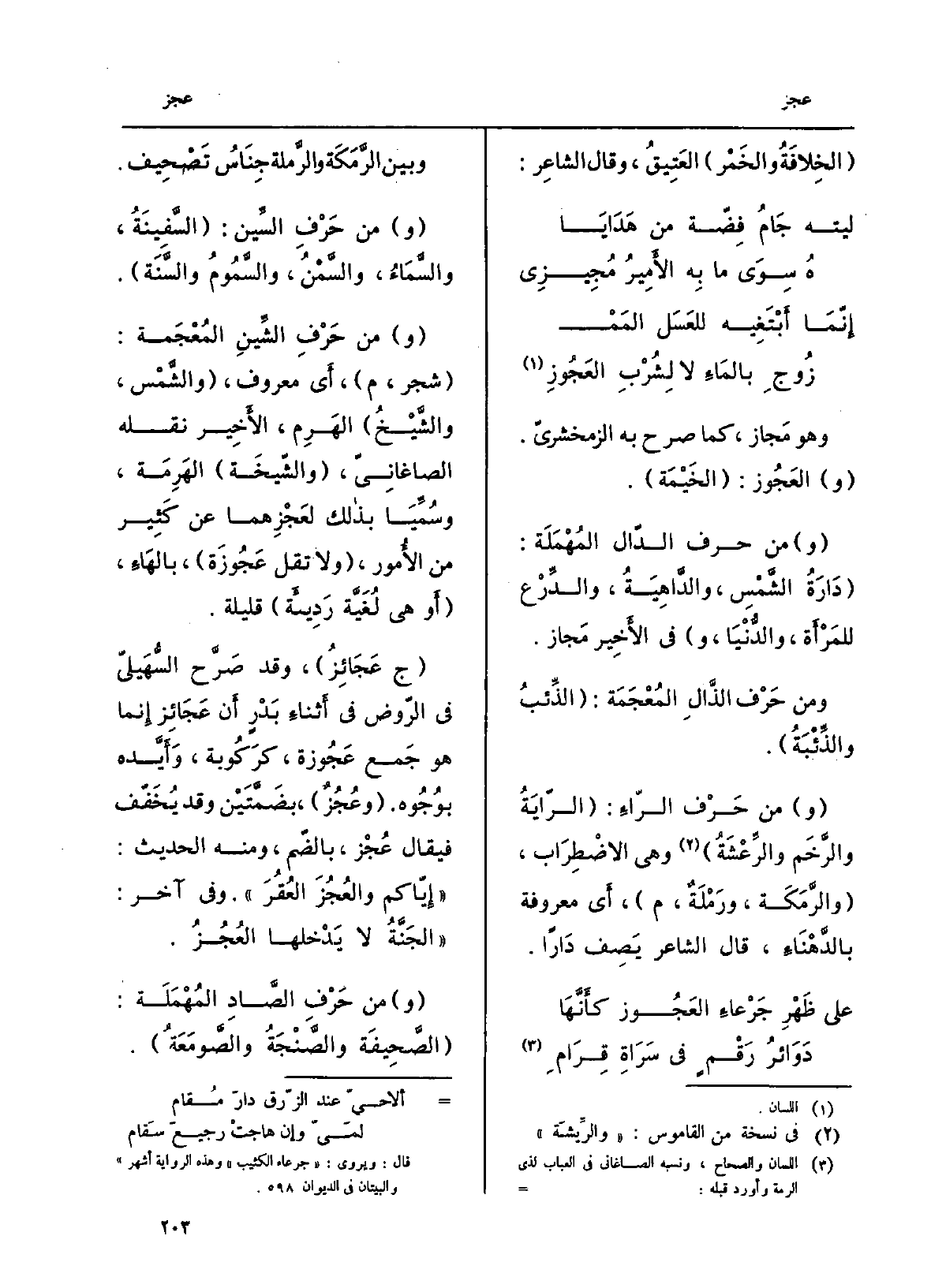 وَبَين الرَّمَكَة والرَّمْلَة جِناسُ تَصحيف. من حرف السِّين: السَّفينَةُ، والسَّماءُ، والسَّمْنُ، والسُّمُومُ، والسَّنَة. من حرف الشين المُعجَمَة: شجر، م، أَي مَعْرُوف، والشَّمس، والشَّيخُ الهَرِم، الأَخير نَقله الصَّاغانِيّ، والشَّيخَة الهَرِمَة، وسُمِّيا بذلك لعجزهما عَن كثير من الأُمور، وَلَا تقل عَجُوزَة، بالهاءِ، أَو هِيَ لُغَيَّة رَدِيئَة قَليلَة. ج عَجائزُ، وَقد صَرَّح السُّهَيلِيّ فِي الرَّوض فِي أَثناءِ بَدْرٍ أَنَّ عَجَائِز إنَّما هُوَ جَمع عَجُوزة، كرَكُوبَة، وأَيَّده بوجُوه. وعُجُزٌ، بضَمَّتين وَقد يُخَفَّف فَيُقَال عُجْز، بالضَّمّ، وَمِنْه الحَدِيث: إيّاكُم والعُجُزَ العُقُرَ. وَفِي آخر: الجَنَّةُ لَا يَدخُلها العُجُزُ.)