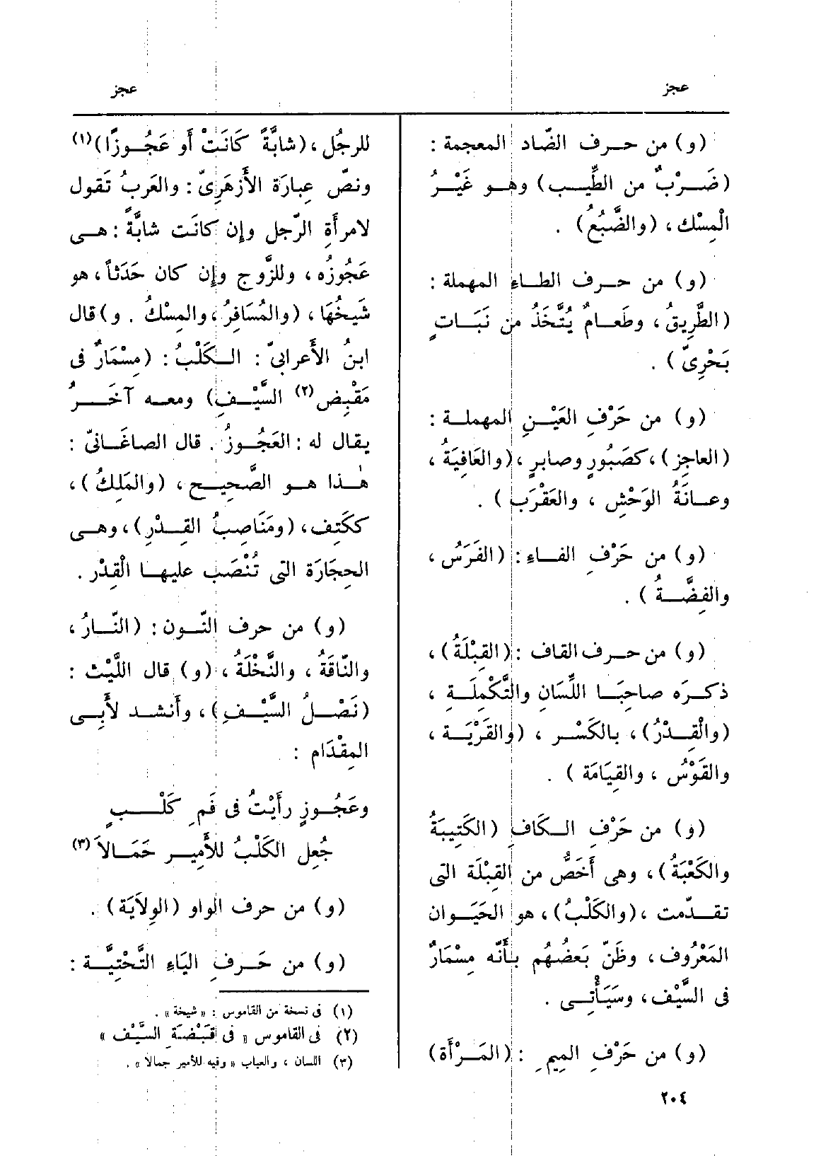 حرف الضَّاد المُعجَمة: ضَرْبٌ من الطِّيب وَهُوَ غيرُ الْمسك، والضَّبُعُ. من حرف الطَّاءِ المهملَة: الطَّريقُ، وطَعامٌ يُتَّخَذُ من نباتٍ بَحرِيٍّ. من حرف الْعين المُهملة: العاجِز، كصَبُورٍ وصابرٍ، والعافيةُ، وعانَةُ الوَحْش، والعقرَب. مِمَّن حرف الفاءِ: الفَرَسُ، والفِضَّةُ. من حرف الْقَاف: القِبْلَةُ، ذكَرَه صاحبا اللِّسَان والتَّكملة، والقِدْرُ، بالكَسْر، والقَريَة، والقَوْسُ، والقِيامَة. من حرف الْكَاف: الكَتيبَةُ والكَعْبَةُ، وَهِي أَخَصُّ من القِبلَة الَّتِي تقدَّمت، والكَلْبُ، هُوَ الْحَيَوَان المَعروف، وظَنَّ بعضُهم بأَنَّه مِسْمارٌ فِي السَّيْف، وسيأْتي. من حرف الْمِيم: المَرأَة للرجُل، شابَّةً كَانَت أَو عجوزاً، وَنَصّ عبارَة الأَزهريّ: والعَرَب تَقول لامرأَة الرَّجل وَإِن كَانَت شابَّةً: هِيَ عَجُوزُه، وَللزَّوْج وَإِن كَانَ حَدَثاً، هُوَ شيخُها، والمَسافِرُ، والمِسْكُ، قَالَ ابْن الأَعرابيّ: الكلْبُ: مِسْمارٌ فِي مَقْبِضِ السَّيْف وَمَعَهُ آخَر يُقَال لَهُ: العَجُوزُ، قَالَ الصَّاغانِيّ: هَذَا هُوَ الصَّحِيح، والمَلِكُ، ككَتِف، ومَناصِبُ القِدْرِ، وَهِي الحِجارة الَّتِي تُنصَب عَلَيْهَا القِدْر. من حرف النّون: النَّار، والنَّاقة، والنَّخْلَة، قَالَ اللَّيْث: نَصْلُ السَّيف، وأَنشد لأبي المِقدام: