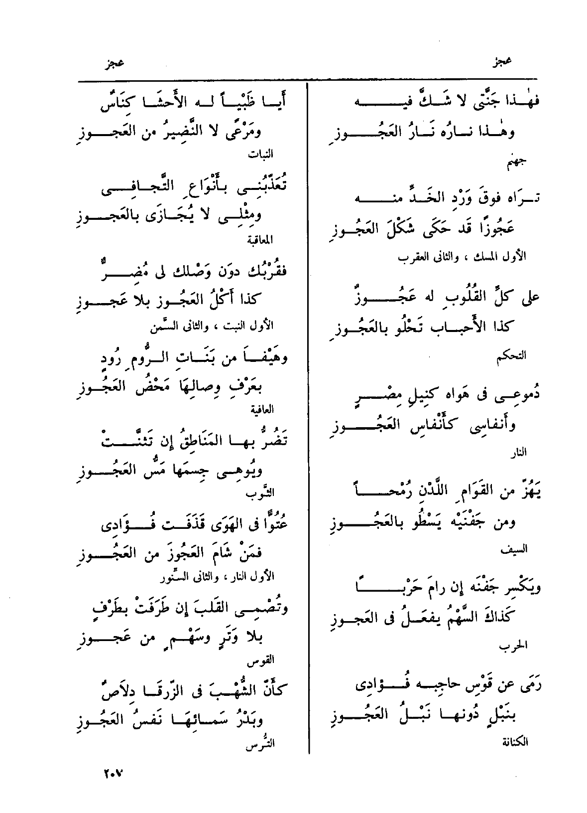(فقُرْبُكَ دُونَ وَصْلِكَ لي مُضِرٌّ ... كَذَا أَكلُ العَجُوز بِلَا عَجُوزِ)
