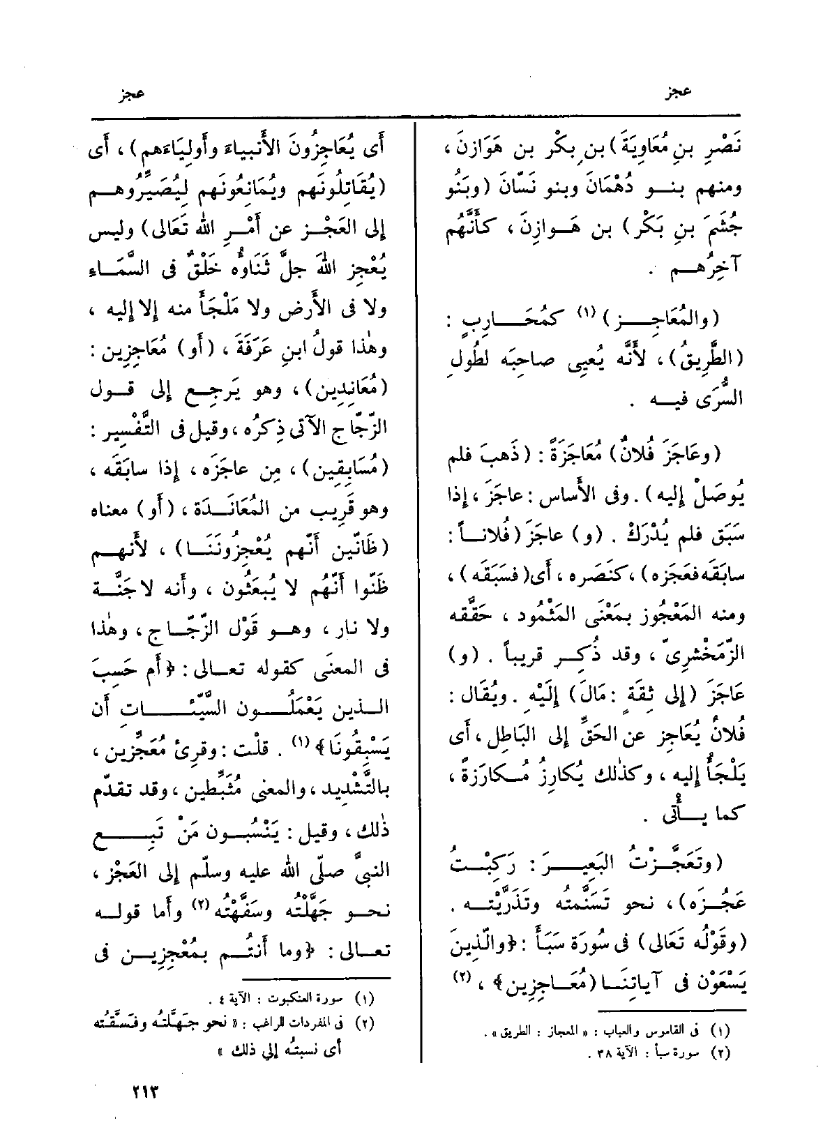 نَصْرِ بن مُعاوِيَةَ بن بَكْر بن هَوازِنَ، وَمِنْهُم بَنو دُهمانَ وبَنو نَسَّانَ وَبَنُو جُشَمَ بنِ بَكْر بنِ هَوازِنَ، كأَنَّهم آخِرُهم. والمُعاجِز كمُحارِبٍ: الطَّريقُ، لأَنَّه يُعيِي صاحبَه لطُولِ السُّرَى فِيهِ. وعاجَزَ فلانٌ مُعاجَزَةً: ذهب فَلم يُوصَلْ إِلَيْهِ. وَفِي الأَساس: عاجَزَ، إِذا سبَقَ فَلم يُدْرَكْ.