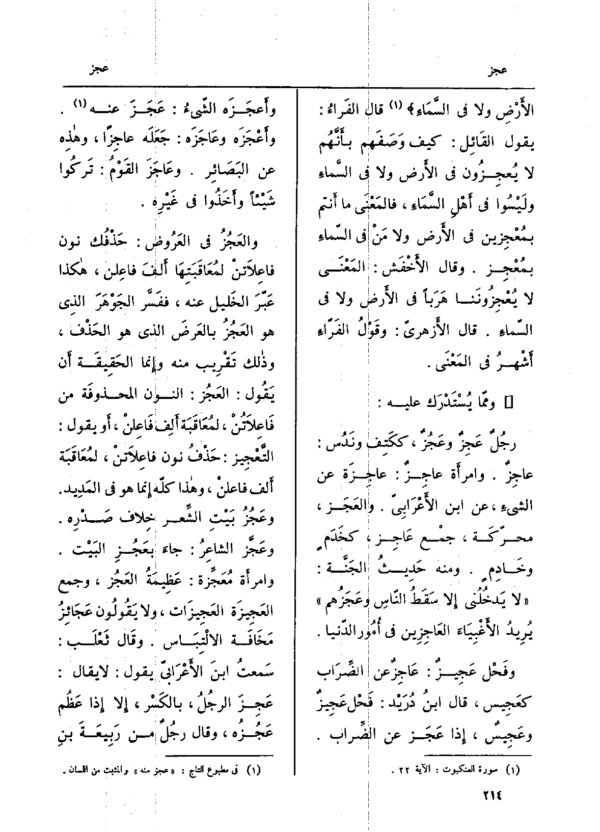 الأَرض وَلَا فِي السَّماءِ، قَالَ الفرّاءُ: كَيفَ وَصفهم بأَنَّهم لَا يُعجِزون فِي الأَرض وَلَا فِي السَّماء، فَالْمَعْنى مَا أَنتم بمُعجِزين فِي الأَرض وَلَا من فِي السَّماءِ بمُعجِز. وَقَالَ الأَخفش: المَعنى لَا يُعْجِزونَنا هَرَباً فِي الأَرض وَلَا فِي السَّماءِ. قَالَ الأَزْهَرِيّ: وقولُ الفرّاءِ أَشهرُ فِي المَعنَى. وَمِمَّا يسْتَدرك عَلَيْهِ: رَجُلٌ عَجِزٌ وعَجُزٌ، ككَتف ونَدُس: عاجِزٌ. وامْرأَةٌ عاجِزٌ: عاجِزَةٌ عَن الشَّيء، عَن ابْن الأَعرابيّ. والعَجَز، محرَّكة، جمع عاجِز، كخَدَمٍ وخادمٍ. وَمِنْه حَديثُ الجَنَّة: لَا يَدْخُلُني إلاّ سَقَطُ النّاسِ وعَجَزُهم يريدُ الأَغبياءَ العاجِزين فِي أُمور الدّنيا. وفَحلٌ عَجِيزٌ: عاجِزٌ عَن الضِّراب كعجِيس، قَالَ ابْن دُرَيْد: فَحْل عَجِيزٌ وعَجِيسٌ، إِذا عَجَز عَن الضِّراب. وأَعجَزَه الشَّيْءُ: عَجَزَ عَنهُ. وأَعجَزَه وعاجَزَه: جعلَه عاجِزاً، وَهَذِه عَن البصائر. وعاجَزَ القَومُ: تَركُوا شَيْئا وأَخَذوا فِي غَيرِه.