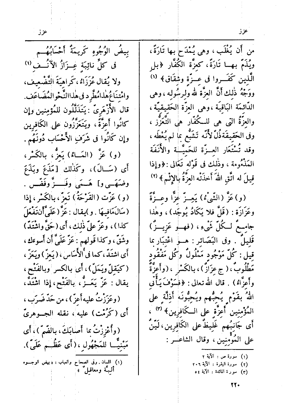 من أَن يُغلَب، وَهِي يُمدَح بهَا تَارَة، ويُذَمُّ بهَا تَارَة، كعِزَّة الكُفّار: بل الَّذين كَفروا فِي {عِزَّةٍ وشِقاق ووَجهُ ذَلِك أنّ} العِزَّة لله وَلِرَسُولِهِ، وَهِي الدائمةُ الْبَاقِيَة، وَهِي العِزَّة الْحَقِيقِيَّة، {والعِزَّةُ الَّتِي هِيَ للكفّار هِيَ} التَّعَزُّز، وَفِي الْحَقِيقَة ذُلّ لأنّه تشَبُّع بِمَا لم يُعطَه، وَقد تُستَعار {العِزّة للحَمِيَّة والأنَفَة المذمومة، وَذَلِكَ فِي قَوْلهُ تَعالى: وَإِذا قيل لَهُ اتَّقِ اللهَ أَخَذَتْه العِزَّةُ بالإثْم} عَزَّ الشيءُ {يَعِزُّ} عِزَّاً {وعِزَّةً} وعَزازَة: قَلَّ فَلَا يكادُ يُوجَد، وَهَذَا جامِعٌ لكلِّ شيءٍ، فَهُوَ {عَزيزٌ قليلٌ. وَفِي البَصائر: هُوَ اعْتِبار بِمَا قيل: كلّ موجودٍ مَمْلُولٌ وكلّ مَفْقُودٍ مَطْلُوبٌ، ج} عِزَازٌ، بِالْكَسْرِ، {وأَعِزَّةٌ} وأَعِزَّاء. قَالَ اللهُ تَعَالَى: فَسَوْفَ يَأْتِي اللهُ بقومٍ يُحبُّهم ويُحبِّونَه أَذِلَّةٍ على الْمُؤمنِينَ {أَعِزَّةٍ على الْكَافرين، أَي جانبُهم غليظٌ على الْكَافرين، لَيِّنٌ)