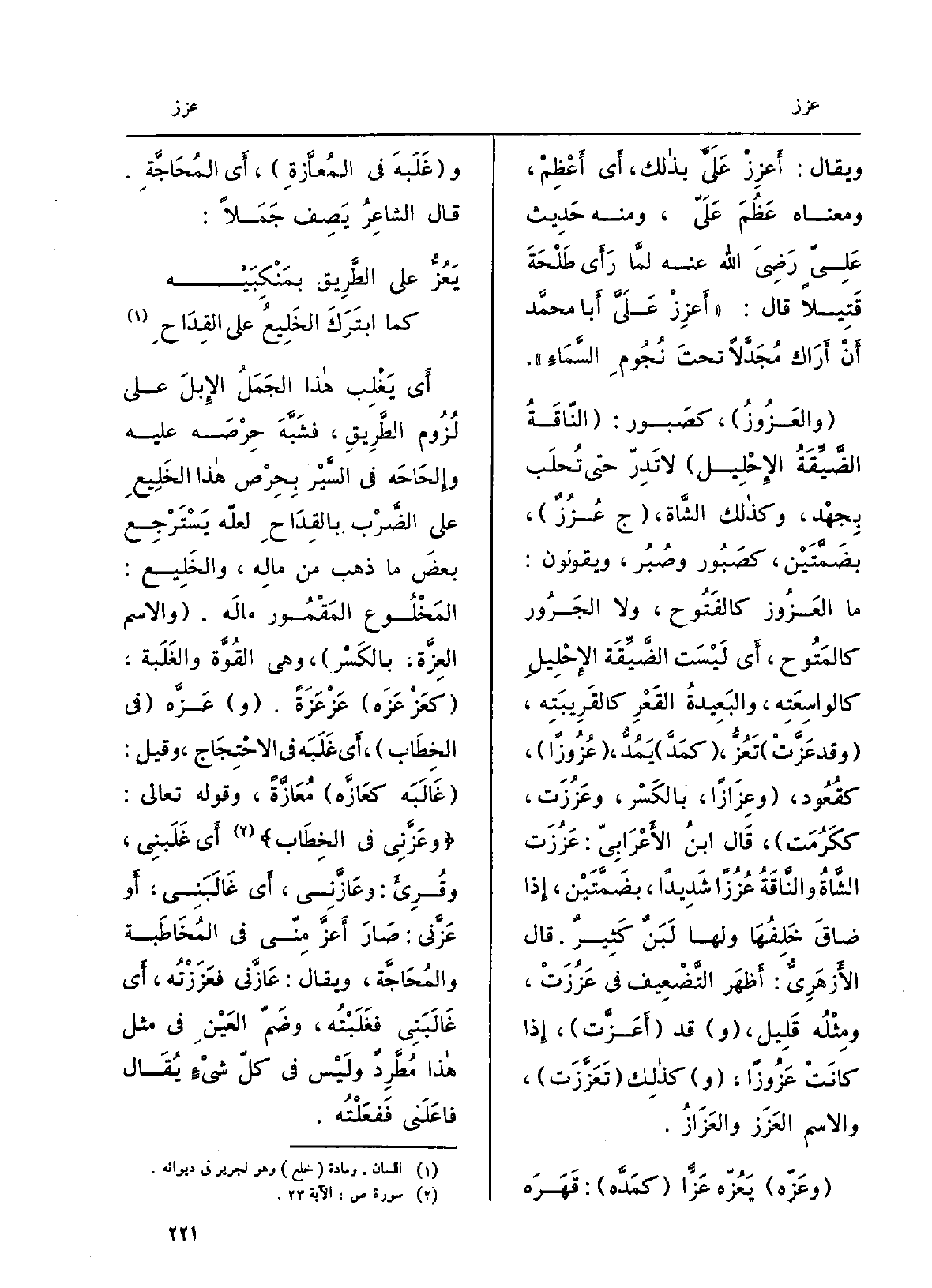 أَي يَغْلِب هَذَا الجمَلُ الإبلَ على لُزومِ الطَّرِيق، فشَبَّه حِرصَه عَلَيْهِ وإلحاحَه فِي السَّيْر بحِرْص هَذَا الخليعِ على الضَّرْب بالقِداح لعلّه يَسْتَرجِع بعض مَا ذهب من مالِه، والخليع: المَخْلوع المَقْمور مالَه. وَالِاسْم} العِزَّة، بِالْكَسْرِ، وَهِي القُوَّة والغَلَبة، {كعَزْعَزَه} عَزْعَزةً. {عَزَّه فِي الخِطاب، أَي غَلَبَه فِي الاحْتِجاج، وَقيل: غالَبَه} كعازَّه {مُعازَّةً، وقَوْلهُ تَعالى:} - وعَزَّني فِي الخِطاب أَي غَلَبَني، وقُرِئَ: {- وعازَّني، أَي غالَبَني، أَو} - عَزَّني: صارَ {أعزَّ مِنّي فِي المُخاطَبَة والمُحاجَّة، وَيُقَال:} - عازَّني! فَعَزَزْتُه، أَي غالَبَني فَغَلَبْتُه، وضمّ العَينِ فِي مثل هَذَا مُطَّرِدٌ وَلَيْسَ)