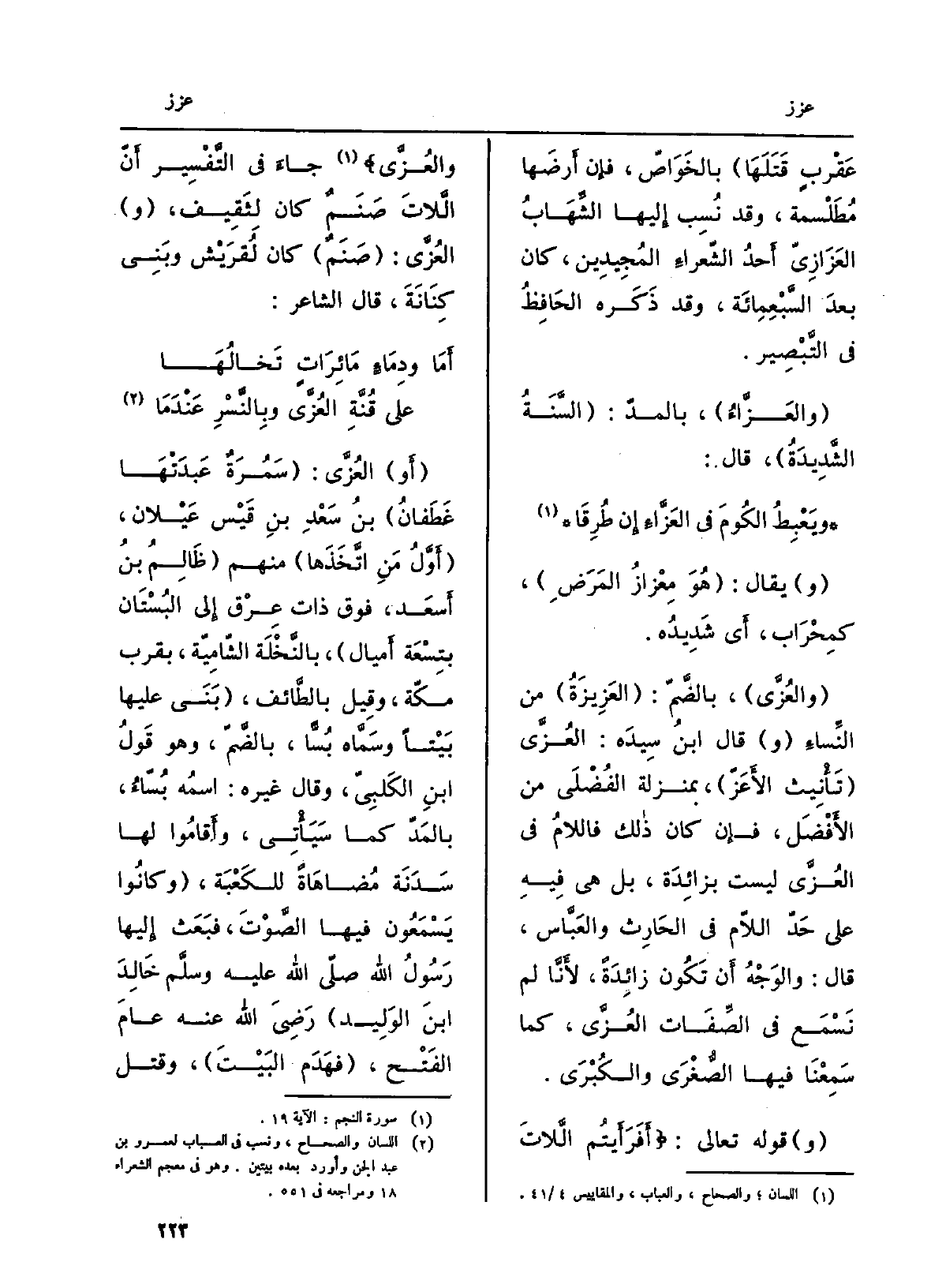 عَقْرَبٍ قَتَلَها بالخَواصّ، فإنّ أَرْضَها مُطَلْسمة، وَقد نُسِبَ إِلَيْهَا الشِّهابُ {- العَزازِيّ أحدُ الشُّعراءِ المُجيدين، كَانَ بعد السَّبْعِمائة، وَقد ذَكَرَه الحافظُ فِي التبصير.} والعَزَّاءُ، بالمدّ: السَّنَةُ الشديدةُ، قَالَ: ويَعْبِطُ الكُومَ فِي {العَزَّاءِ إِن طُرِقا يُقَال: هُوَ} مِعْزازُ المرَضِ، كمِحْراب: أَي شديدُه. {والعُزَّى، بالضمّ:} العَزيزةُ من النِّساء. قَالَ ابنُ سِيدَه: العُزَّى: تأنيثُ {الأَعَزّ، بمنزلةِ الفُضْلى من الأَفْضَل، فَإِن كَانَ ذَلِك فاللامُ فِي} العُزّى لَيست بزائدة، بل هِيَ فِيهِ على حدِّ اللَّام فِي الحارِثِ والعَبَّاس، قَالَ: والوَجهُ أَن تكون زَائِدَة، لأنّا لم نَسْمَع فِي الصِّفات العُزَّى، كَمَا سَمِعْنا فِيهَا الصُّغْرى والكُبْرى. قَوْلهُ تَعالى: أَفَرَأَيْتُمُ اللاتَ والعُزَّى جَاءَ فِي التَّفْسِير أنّ اللاتَ صَنَمٌ كَانَ لثَقيف، والعُزَّى: صنَمٌ كَانَ لقُرَيْش وبَني كِنانة،)