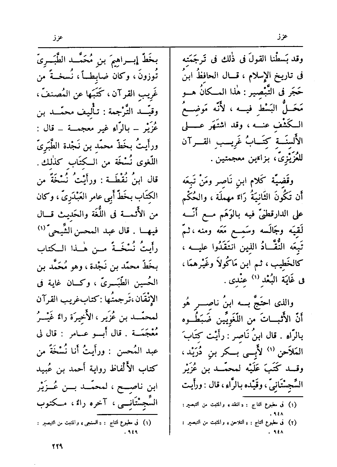 وَقد بسَّطنا القولَ فِي ذَلِك فِي ترجمَتِه فِي تَارِيخ الْإِسْلَام، قَالَ الحافظُ ابنُ حَجَر فِي التبصير: هَذَا المكانُ هُوَ محَلُّ البَسْطِ فِيهِ، لِأَنَّهُ مَوْضِعُ الكَشفِ عَنهُ، وَقد اشتهرَ على الألسنةِ كِتابُ غريبِ الْقُرْآن للعُزَيْزِيّ، بزاءَيْن مُعجمَتَيْن. وقضيّة كَلَام ابنِ نَاصِر ومَن تَبِعَه أَن تكون الثانيةُ رَاء مُهمَلة، والحُكم على الدارقطنيّ فِيهِ بالوَهم مَعَ أنّه لَقِيَه وجالَسه وسَمِعَ مَعَه وَمِنْه، ثمّ تَبِعَه النُّقَّادُ الَّذين انْتقَدوا عَلَيْهِ، كالخطيب، ثمّ ابْن مَاكُولَا وَغَيرهمَا، فِي غَايَة البُعدِ عِندي. وَالَّذِي احتجَّ بِهِ ابنُ نَاصِر هُوَ أنّ الأَثبات من اللُّغَوِيِّين ضَبطوه بالراء. قَالَ ابنُ نَاصِر: رأيتُ كتابَ المَلاحن لأبي بكر بن دُرَيْد، وَقد كَتَبَ عَلَيْهِ لمُحَمد بن عُزَيْز السِّجِسْتانيّ، وقيّدَه بالراء، قَالَ: وَرَأَيْت بخطِّ إبراهيمَ بن مُحَمَّد الطَّبَريّ تُوزون، وَكَانَ ضابطاً، نُسخةً من غَرِيب الْقُرْآن، كَتَبَها عَن المُصَنِّف، وقيّد التَّرْجَمَة: تأليف مُحَمَّد بن عُزَيْر بالراء غير مُعْجمَة قَالَ: ورأيتُ بخطّ مُحَمَّد بن نجدة الطَّبَريّ اللغويّ نُسخة من الْكتاب كَذَلِك. قَالَ ابنُ نُقطة: ورأيتُ نُسخةً من الْكتاب بخطِّ أبي عامرٍ العَبْدَريّ، وَكَانَ من الأئمّة فِي اللُّغَة والْحَدِيث قَالَ فِيهَا: قَالَ عبد المحسن الشِّيحيّ رأيتُ نُسْخَة من هَذَا الْكتاب بخطِّ مُحَمَّد بن نَجْدَة، وَهُوَ مُحَمَّد بن الْحُسَيْن الطَّبَريّ، وَكَانَ غَايَة فِي الإتقان، ترجمَتُها: كتاب غَرِيب الْقُرْآن لمُحَمد بن عُزَيْر، الْأَخِيرَة راءٌ غير مُعجمَة. قَالَ أَبُو عَامر: قَالَ لي عبد المُحسن: ورأيتُ أَنا نُسْخَة من كتاب الْأَلْفَاظ رِوَايَة أَحْمد بن عُبَيْد بن نَاصح، لمُحَمد بن عُزَيْر السِّجِسْتانيّ، آخرُه رَاء، مَكْتُوب