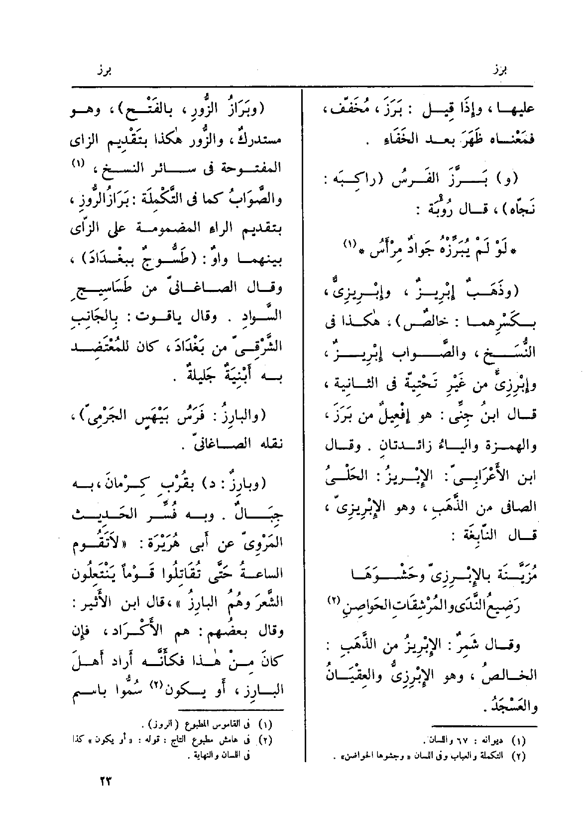 عَلَيْهَا، وَإِذا قيل: بَرَزَ، مُخفّف، فَمَعْنَاه ظَهَرَ بعد الخَفاء. بَرَّزَ الفرَسُ راكِبَه: نَجّاه، قَالَ رُؤْبة: لَو لم يُبَرِّزْهُ جَوادٌ مِرْأَسُ وذهبٌ إبْريزٌ، وإبْريزيٌّ، بكسرِهما: خالصٌ، هَكَذَا فِي النُّسَخ، والصوابُ إبْريزٌ، وإبْرِزِيٌّ من غَيْرِ تَحْتِيّة فِي الثَّانِيَة، قَالَ ابنُ جنّي: هُوَ إفْعيلٌ من بَرَزَ، والهمزةُ والياءُ زائدتان. وَقَالَ ابْن الأَعْرابِيّ: الإبْريزُ: الحَلْيُ الصافي من الذَّهَب، وَهُوَ الإبْريزيّ، قَالَ النَّابِغَة: