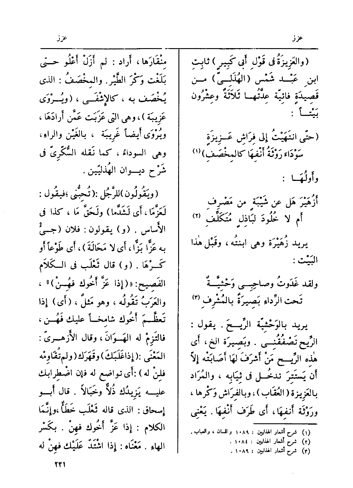 يُرِيد بالوَحشيّة الرِّيح. يَقُول: الرِّيح تَصْفُقُني. وبَصيرة الخ، أَي هَذِه الرّيح مَن أَشْرَفَ لَهَا أصابَتْه إلاّ أَن يَسْتَتِرَ تدخل فِي ثِيَابه، والمُراد {بالعَزيزة العُقاب، وبالفِراش وَكْرُها، ورَوْثَةُ أَنْفِها، أَي طرف أَنْفِها. يَعْنِي مِنقارَها، أَرَادَ: لم أَزَلْ أَعْلُو حَتَّى بَلَغْت وَكْرَ الطَّيْر. والمِخْصَف: الَّذِي يُخصَف بِهِ، كالإشْفى، ويُروى عَزيبة، وَهِي الَّتِي عَزَبَت عمّن أرادها، ويُروى أَيْضا غَريبة، بالغَيْن وَالرَّاء، وَهِي السَّوداء، كَمَا نَقله السُّكَّريّ فِي شَرْحِ ديوَان الهُذليِّين. وَيَقُولُونَ للرجل:) تُحبُّني فَيَقُول:} لَعَزَّ مَا، أَي لَشَدَّما ولَحَقَّ مَا، كَذَا فِي الأساس. يَقُولُونَ: فلَان جِئْ بِهِ {عَزَّاً بَزَّاً، أَي لَا مَحالة، أَي طَوْعَاً أَو كَرْهَاً. قَالَ ثَعْلَب فِي الْكَلَام الفَصيح: إِذا} عَزَّ أَخُوك فهُنْ، والعربُ تقولُه، وَهُوَ مثَلٌ، أَي إِذا تعَظَّمَ أَخُوك شامِخاً عَلَيْك فهُن، فالتَزِم لَهُ الهَوان، وَقَالَ الأَزْهَرِيّ: الْمَعْنى: إِذا غَلَبَك وقَهَرَك وَلم تُقاوِمه فلِنْ لَهُ: أَي تَواضَع لَهُ فَإِن اضطرابَك عَلَيْهِ يزيدُك ذُلاًّ وخَبالاً. قَالَ أَبُو إِسْحَاق: الَّذِي قَالَه ثَعْلَب خطأٌ، وإنّما الْكَلَام: إِذا عَزَّ أَخُوك فهِنْ. بكسرِ الهاءِ، مَعْنَاهُ: إِذا اشتدَّ عَلَيْك فهِنْ لَهُ