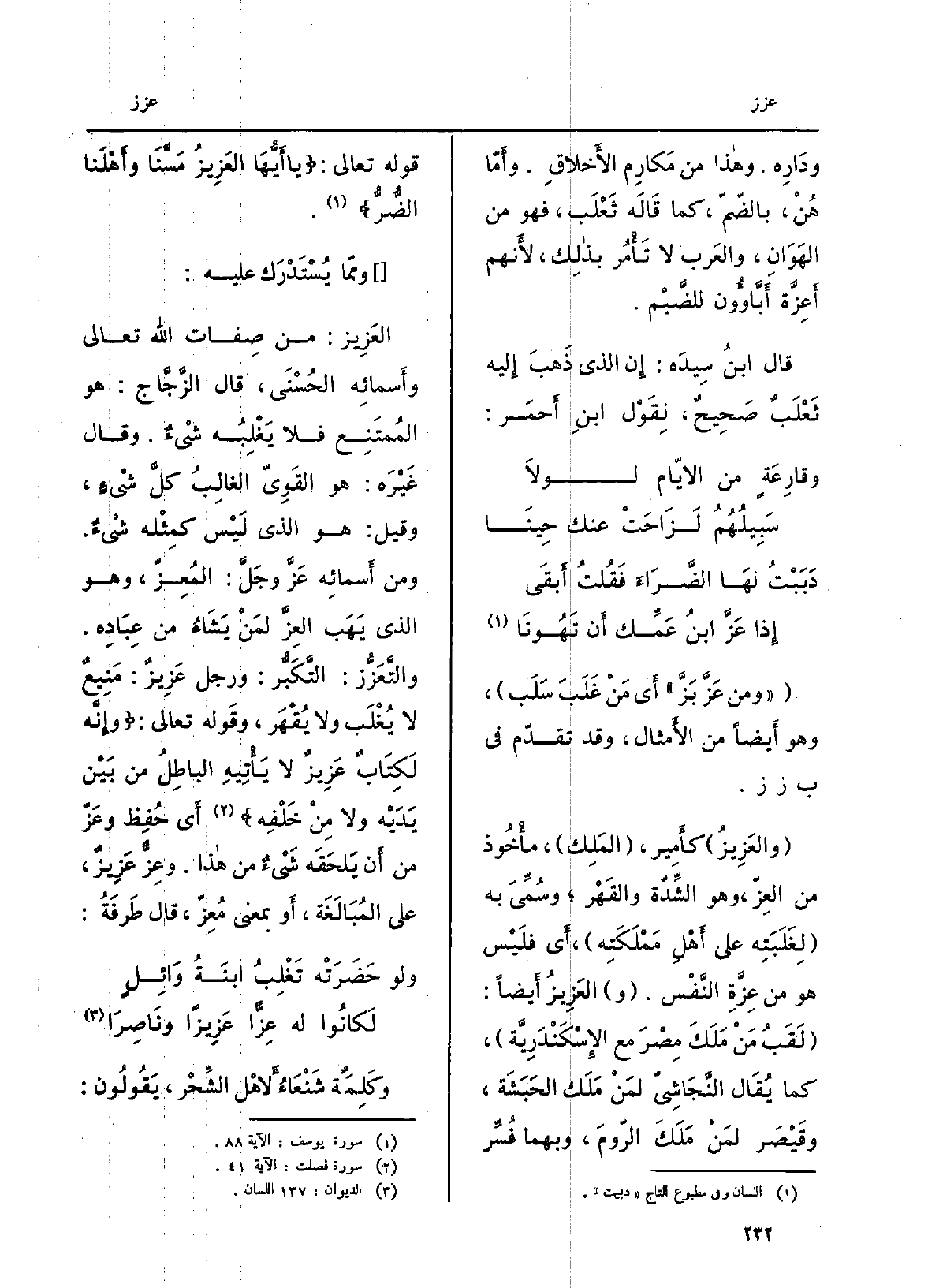 والتَّعَزُّز: التَّكَبُّر، ورجلٌ عَزيزٌ: مَنيعٌ لَا يُغلَب وَلَا يُقهَر، وقَوْلهُ تَعالى: وإنّه لكِتابٌ {عَزيزٌ لَا يأتيهِ الباطِلُ من بَيْنِ يَدَيْه وَلَا مِن خَلْفِه أَي حُفِظَ وعَزَّ من أَن يَلْحَقَه شيءٌ من هَذَا.} وعِزٌّ {عَزيزٌ، على المُبالَغة، أَو بِمَعْنى مُعِزّ، قَالَ طَرَفَةُ: