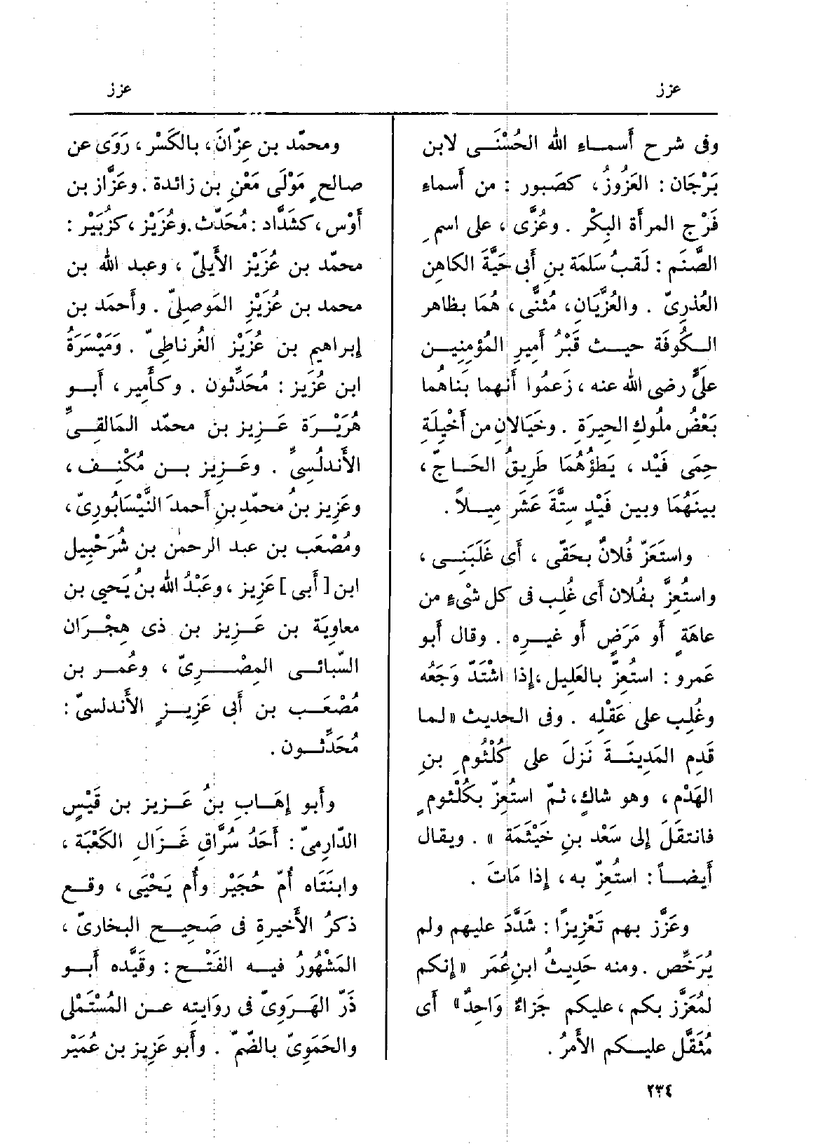 وَفِي شرح أَسماء الله الْحسنى لِابْنِ بَرْجان: {العَزُوزُ، كصَبُور: من أَسماء فَرْج المَرأَة البِكْر.} وعُزَّى، على اسْم الصَّنَم: لَقَبُ سَلَمَة بن أَبي حَيَّةَ الكاهن العُذرِيّ. {والعُزَّيان، مُثَنَّى، هما بِظَاهِر الكُوفة حَيْثُ قبر أَمير الْمُؤمنِينَ عليّ رَضِي الله عَنهُ، زَعَمُوا أَنَّهما بناهما بعضُ مُلُوك الْحيرَة. وخَيالان من أَخيِلَة حِمَى فَيْد، يطَؤُهما طَرِيق الحاجّ، بَينهمَا وَبَين فَيْدٍ ستَّةَ عشَرَ مِيلاً.} واسْتَعَزَّ فلانٌ بحَقِّي، أَي غلبَني، {واسْتُعِزَّ بفلان أَي غُلِبَ فِي كلِّ شيءٍ من عاهةٍ أَو مَرَضٍ أَو غيرِه. وَقَالَ أَبو عَمْرو:} اسْتُعِزَّ بالعليل، إِذا اشتدَّ وجَعُه وغُلِبَ على عَقْلِه. وَفِي الحَدِيث لمّا قدِمَ المَدينةَ نزلَ على كُلْثُومِ بنِ الهَدْمِ، وَهُوَ شاكٍ، ثمَّ اسْتُعِزَّ بكُلثومٍ فانتقلَ إِلَى سعد بنِ خَيْثَمَة. وَيُقَال أَيضاً: {اسْتُعِزَّ بِهِ، إِذا ماتَ.} وعَزَّزَ بهم {تَعْزيزاً: شَدَّدَ عَلَيْهِم وَلم يُرَخِّص. وَمِنْه حديثُ ابْن عُمَ: إنَّه} لَمُعَزَّزٌ بكم، عَلَيْكُم جَزاءٌ واحدٌ أَي مُثَقَّلٌ عَلَيْكُم الأَمرُ. ومحمّد بن {عِزَّان، بالكَسْر، رَوَى عَن صالحٍ مَولَى مَعْنِ بن زَائِدَة.} وعَزَّاز بن أَوْس، كشدَّاد: مُحَدِّث. {وعُزَيْز، كزُبَيْر: مُحَمَّد بن} عُزَيْزِ الأَيْلِيّ، وعَبْد الله بن مُحَمَّد بن عُزَيز المَوصِلِيّ. وأَحمد بن إِبْرَاهِيم بن عُزَيز الغرناطيّ. ومَيْسَرة بن عُزَيْز: مَحَدِّثون. وكأَمير، أَبو هُرَيْرَة عَزيز بن مُحَمَّد المَالقيّ الأَندلُسِيّ. وعزيز بن مُكْنِف، {وعَزيز بن مُحَمَّد بن أَحمد)