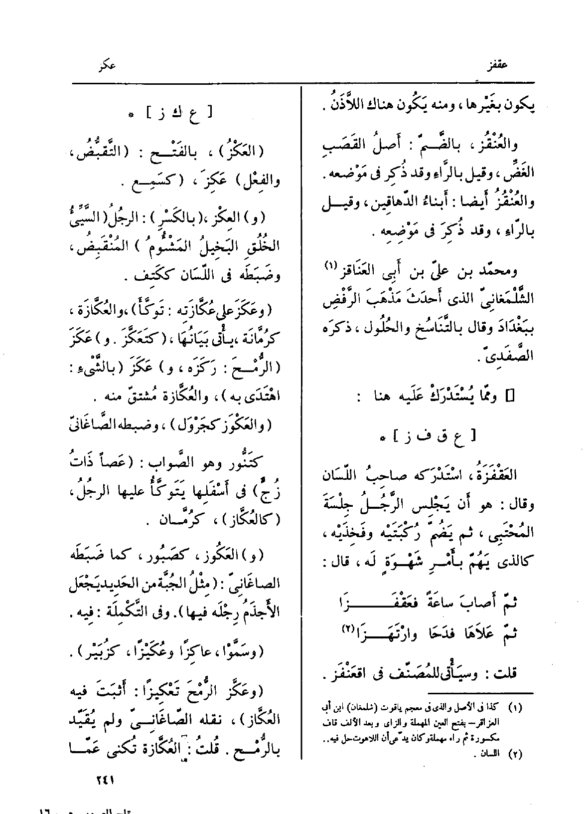 والعَكْوَز كجَرْوَل، وضبطَه الصَّاغانِيّ كتَنُّور وَهُوَ الصَّواب: عَصاً ذاتُ زُجٍّ فِي أَسفلِها يَتَوَكَّأُ عَلَيْهَا الرَّجُلُ، كالعُكَّاز، كرُمَّان. العَكُوز، كصَبُور، كَمَا ضبطَه الصَّاغانِيّ: مثلُ الجُبَّة من الحَديد يَجعَل الأَجْذَمُ رِجْلَه فِيهَا. وَفِي التَّكملة: فِيهِ. وسمَّوا، عاكِزاً وعُكَيْزاً، كزُبَيْر. وعَكَّزَ الرُّمْحَ تَعْكِيزاً: أَثبتَ فِيهِ العُكَّاز، نَقله الصَّاغانِيّ وَلم يقيّد بالرُّمْح. قلتُ: العُكَّازَةُ تُكْنَى عَمّا