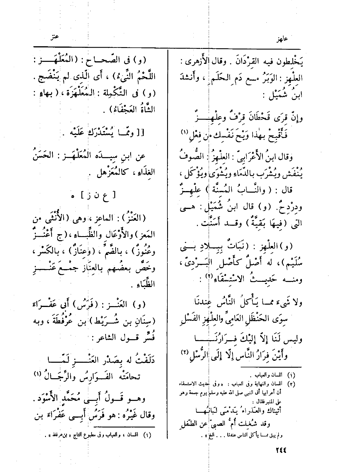 وَقَالَ ابْن الأَعرابيّ: العِلْهِزُ: الصُّوفُ يُنْفَشُ ويُشْرَبُ بالدِّماءِ ويُشْوَى ويُؤْكَل، قَالَ: والنَّابُ المُسِنَّة عِلْهِزٌ ودِرْدِحٌ. قَالَ ابْن شُمَيل: هِيَ الَّتِي فِيهَا بقيَّةٌ وَقد أَسَنَّت. العِلْهِز: نَباتٌ بِبِلَاد بني سُلَيْم، لَهُ أَصْلٌ كأَصل البَرْدِيّ، وَمِنْه حَدِيث الاستسقاءِ: