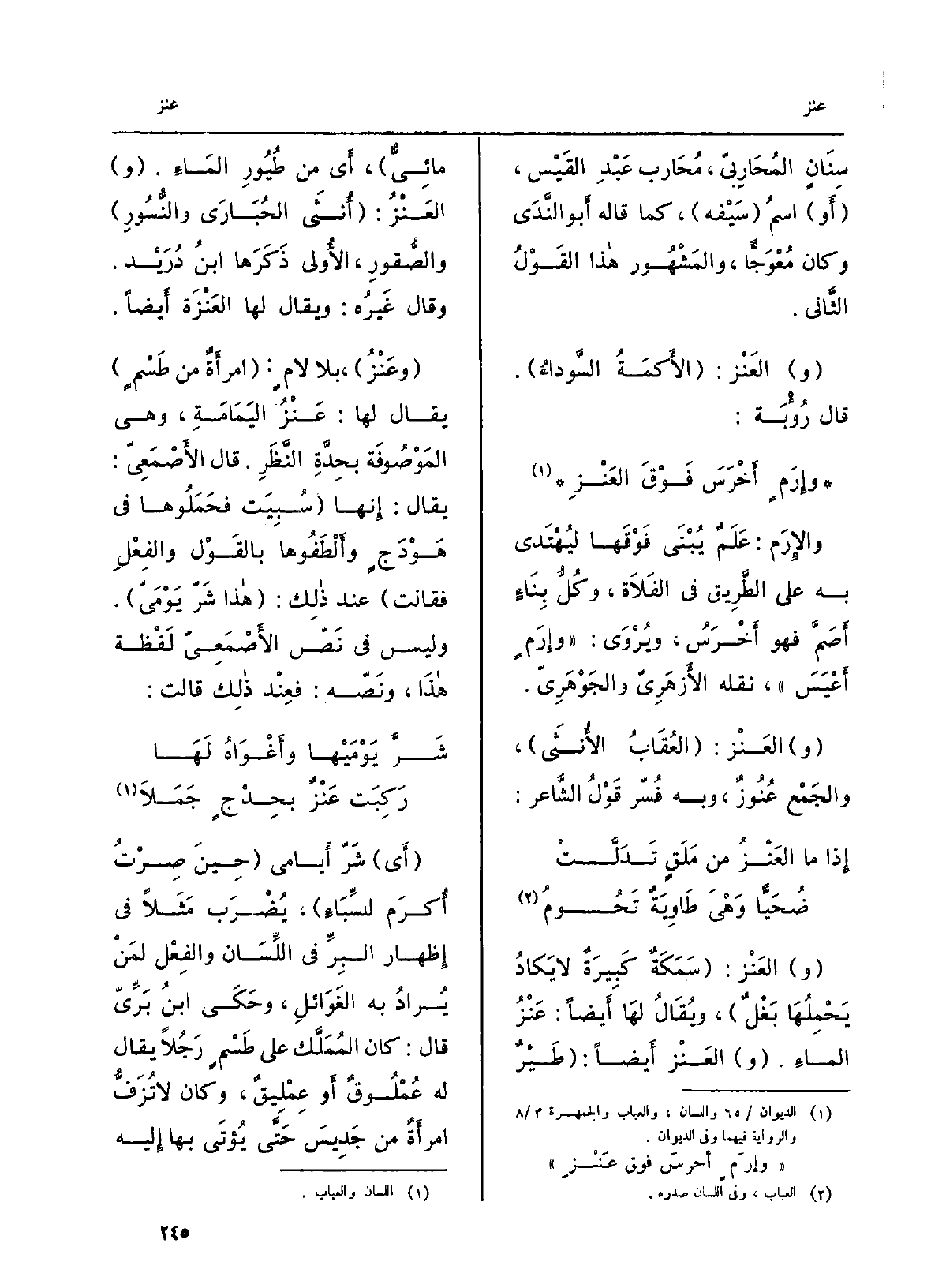 سِنانٍ المُحارِبيّ، مُحارِب عبد الْقَيْس، أَو اسمُ سيفِه، كَمَا قَالَه أَبو النَّدى وكانَ مُعْوَجّاً، والمَشهور هَذَا القَوْل الثَّانِي. العَنْز: الأَكَمَة السَّوداءُ. قَالَ رُؤْبَة: وإرَمٍ أَخْرَسَ فَوْقَ العَنْزِ والإرَم: عَلَمٌ يُبنَى فوقَها ليُهْتَدى بِهِ على الطَّريق فِي الفلاة، وكلُّ بناءٍ أَصَمَّ فَهُوَ أَخرَسُ، ويُرْوَى: وإرَمٍ أَعْيَسَ، نَقله الأَزْهَرِيّ والجَوْهَرِيّ. العَنْزُ: العُقابُ الأُنْثَى، والجَمْع عُنُوزٌ، وَبِه فُسِّر قَول الشاعِر: