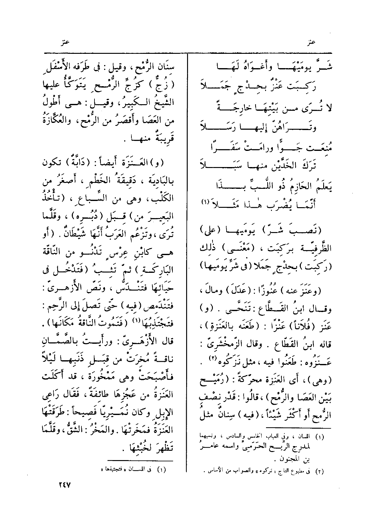 نصَبَ شَرَّ يومَيْها على الظَّرْفِيَّة برَكِبَت، معنى ذَلِك ركِبَت بحِدْجٍ جَمَلا فِي شَرِّ يومَيْها، وعَنَزَ عَنهُ عُنُوزاً: عدَلَ ومالَ، وَقَالَ ابْن القطّاع تنحَّى. عَنَزَ فلَانا عَنْزاً: طعنَه بالعَنَزَةِ، قَالَه ابْن القطّاع. وَقَالَ الزّمخشريّ: عَنَزُوهُ: طَعَنُوا فِيهِ، مثل نَزَكُوه. العَنَزَةَ مُحَرَّكَةً: رُمَيْحٌ بَين الْعَصَا والرُّمْح، قَالُوا: قدْر نِصْفِ الرُّمْح أَو أَكثرَ شيْئاً، فِيهِ سِنانٌ مثلُ سِنانِ الرُّمْح، وَقيل: فِي طَرَفه الأَسْفَلِ زُجٌّ كزُجِّ الرُّمْحِ يتَوَكَّأُ عَلَيْهَا الشيخُ الكبيرُ، وَقيل: هِيَ أَطْوَلُ من الْعَصَا وأَقصَرُ من الرُّمْح، والعُكَّازَةُ قريبةٌ مِنْهَا. العَنَزَة أَيضاً: دابَّةٌ تكون بالبادية، دَقيقَةُ الخَطْمِ، أَصغرُ من الكلْبِ، وَهِي من السِّباع، تأْخُذُ البعيرَ من قِبَلِ دُبُرِه، وقَلَّما تُرَى، وتَزْعُمُ العَرَبُ أَنَّها شيطانٌ. أَو هِيَ)