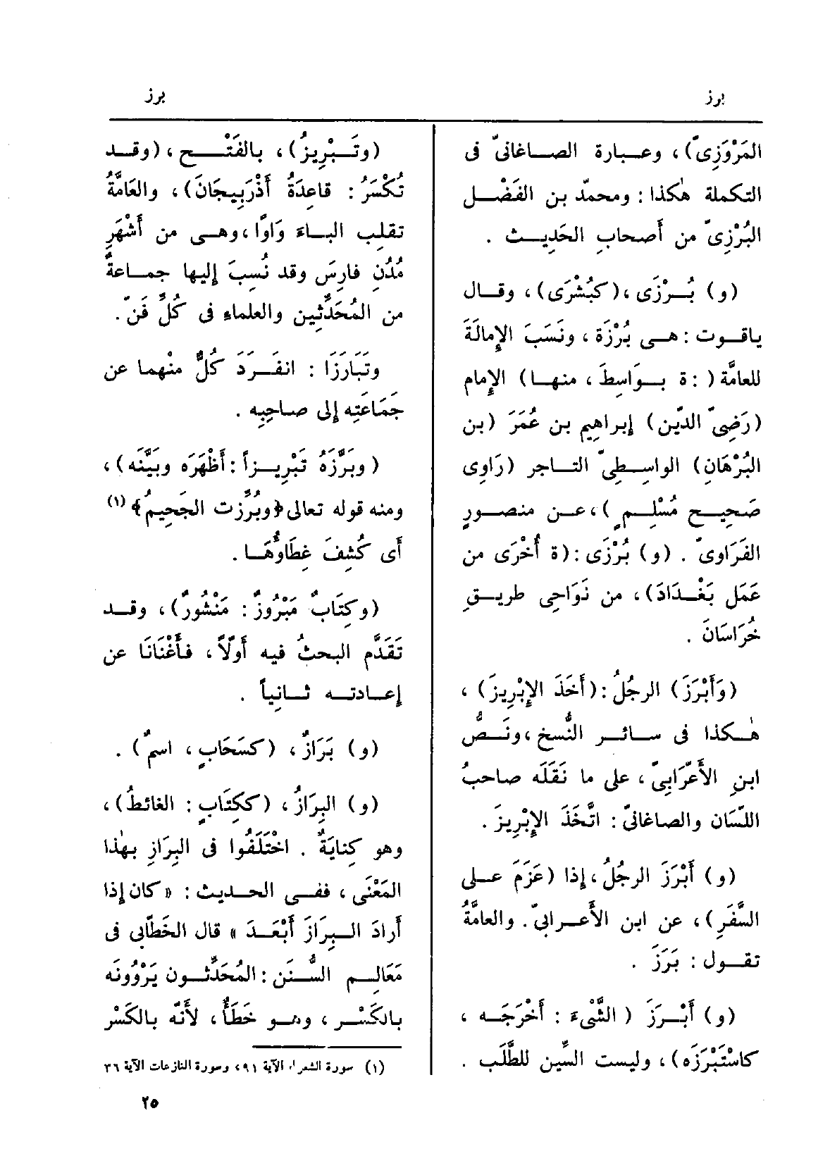 المَرْوَزيّ، وَعبارَة الصَّاغانِيّ فِي التكملة هَكَذَا: وَمُحَمّد بن الْفضل البُرْزيّ من أَصْحَاب الحَدِيث. بُرْزى، كبُشْرى، وَقَالَ ياقوت: هِيَ بُرْزَة، وَنَسَبَ الإمالةَ للعامّة: ة بواسِط، مِنْهَا الإِمَام رَضِيُّ الدّين إِبْرَاهِيم بن عمر بن البُرهان الواسِطيّ التَّاجِر رَاوِي صَحِيح مسلمٍ، عَن منصورٍ الفَرَاويّ. بُرْزى: ة أُخرى من عملِ بَغْدَاد، من نواحي طَرِيق خُراسان. وأَبْرَزَ الرجل آنذ الابريز هَكَذَا فِي سَائِر النّسخ وَنَصّ ابْن الاعرابي على مَا نَقله صَاحب اللِّسَان والصاغاني اتخذ الابريز.، إِذا عَزَمَ على السَّفَر، عَن ابْن الأَعْرابِيّ. والعامّةُ)