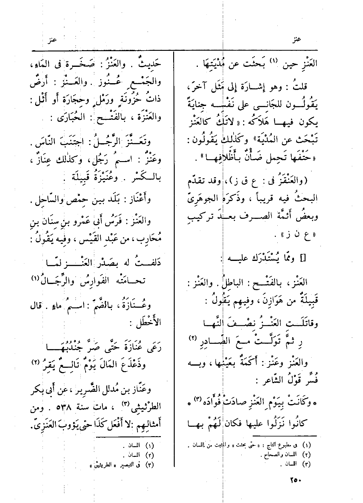 ِ العَنْزِ حِين بَحثَت عَن مُديتِها. قلتُ: وَهُوَ إِشَارَة إِلَى مثَل آخَرَ، يقولونَ للجاني على نَفْسه جِنايةً يكونُ فِيهَا هلاكُه: لَا تَكُ كالعَنْزِ تَبْحث عَن المُدْيَة، وَكَذَلِكَ يَقُولُونَ: حَتْفَها تَحمِل ضَأْنٌ بأَظْلافِها. العَنْقَزُ: فِي عقز، وَقد تقدّم الْبَحْث فِيهِ قَرِيبا، وذكَرَه الجَوْهَرِيّ وَبَعض أَئِمَّة الصَّرف بعدَ تركيبِ عنز. وَمِمَّا يُسْتدرك عَلَيْهِ: العَنْز، بِالْفَتْح: الباطِلُ. والعَنْزُ: قبيلةٌ من هوازِنَ، وَفِيهِمْ يقولُ: