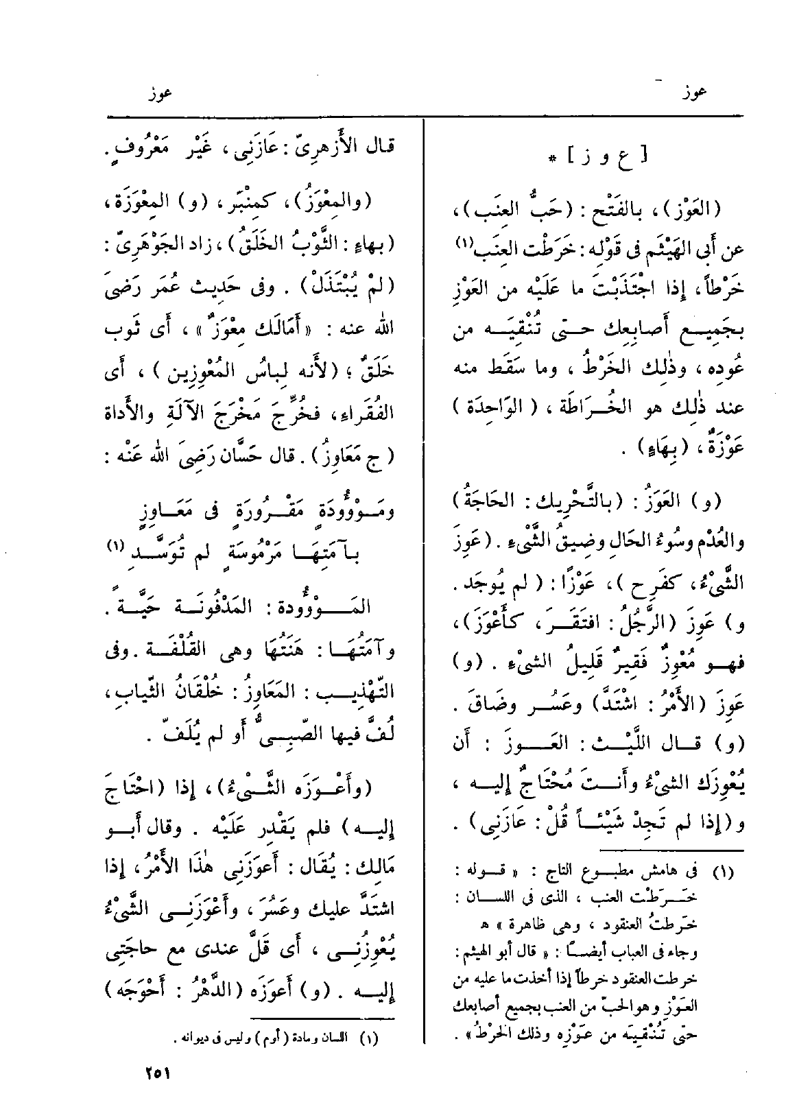 {العَوْز، بالفَتْح: حَبُّ العِنَب، عَن أبي الهَيثم فِي قَوْلِه: خَرَطْتُ العِنَب خَرْطَاً، إِذا اجْتَذبْتَ مَا عَلَيْهِ من العَوْزِ بِجَمِيعِ أصابِعِك حَتَّى تُنْقيه من عُودِه، وَذَلِكَ الخَرْط، وَمَا سَقَطَ مِنْهُ عِنْد ذَلِك هُوَ الخُراطة، الْوَاحِدَة} عَوْزَةٌ، بهاءٍ. العَوْز: بالتّحريك: الحاجةُ والعُدْم وسُوءُ الْحَال وضِيقُ الشَّيْء. {عَوِزَ الشيءُ، كفَرِح،} عَوْزَاً: لم يُوجد. {عَوِزَ الرجلُ: افْتقرَ،} كَأَعْوزَ، فَهُوَ {مُعْوِزٌ فقيرٌ قليلُ الشَّيْء.} عَوِزَ الأمرُ: اشتدَّ وعَسُرَ وضاق. قَالَ اللَّيْث: {العَوز: أَن} يُعْوِزُكَ الشيءُ وَأَنت مُحتاجٌ إِلَيْهِ، وَإِذا لم تَجِدْ شَيْئا قل: {- عازَني. قَالَ الأَزْهَرِيّ: عازَني، غير مَعْرُوفٍ.} والمِعْوَز، كمِنْبَر، {المِعْوَزَة، بهاءٍ: الثوبُ الخَلَق، زَاد الجَوْهَرِيّ: لم يُبْتَذَل. وَفِي حَدِيث عمر رَضِي الله عَنهُ: أمالَكَ} مِعْوَزٌ. أَي ثوب خَلَقٌ لأنّه لباسُ {المُعْوِزين، أَي الْفُقَرَاء، فخُرِّجَ مَخْرَجَ الآلةِ والأداة ج} مَعاوِز. قَالَ حَسّان رَضِي الله عَنهُ: