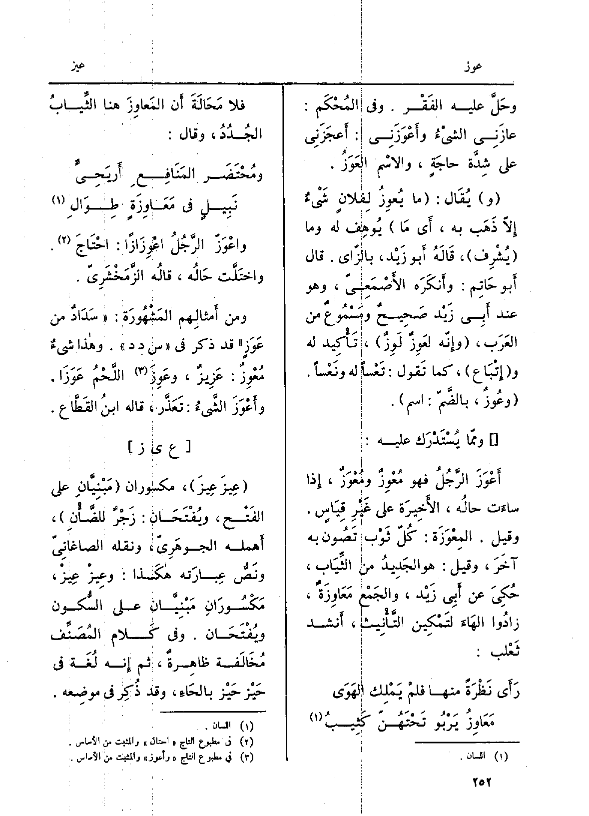 وعُوزٌ، بالضمّ: اسْم. ومِمّا يُسْتَدْرَك عَلَيْهِ:} أَعْوَزَ الرجلُ فَهُوَ {مُعْوِزٌ} ومُعْوَزٌ، إِذا ساءَت حالُه، الْأَخِيرَة على غيرِ قياسٍ. وَقيل: {المِعْوَزَة: كلُّ ثَوْب تَصون بِهِ آخَرَ، وَقيل: هُوَ الجديدُ من الثِّياب، حُكِيَ عَن أبي زَيْد، والجَمع} مَعاوِزَةٌ، زادوا الهاءَ لتَمكين التَّأْنِيث، أنْشد ثَعْلَب:
