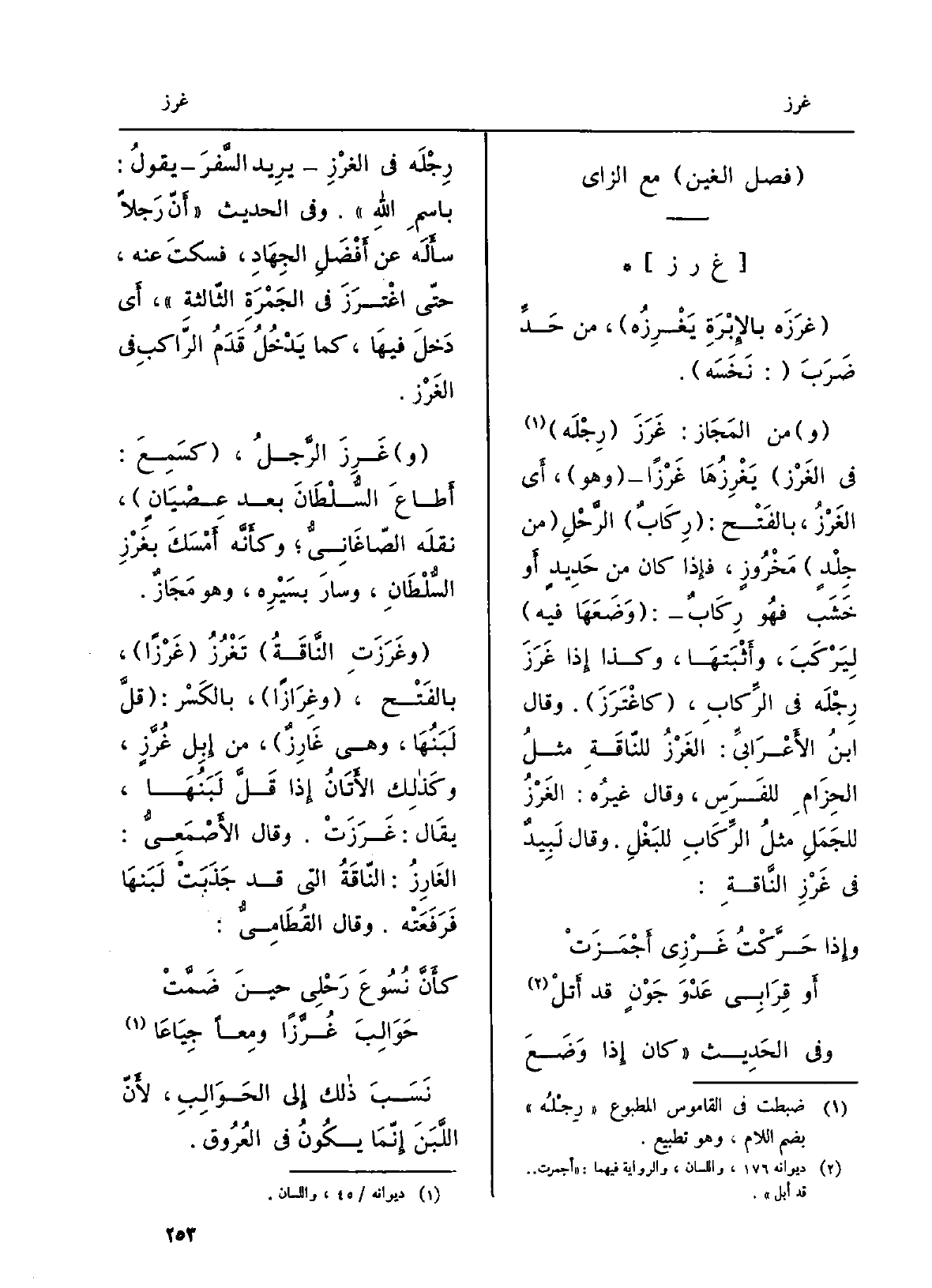 وَفِي الحَدِيث: كَانَ إِذا وَضَعَ رِجلَه فِي الغَرْزِ يُرِيد السفَر يَقُول: باسمِ الله. وَفِي الحَدِيث: أنّ رجلا سألَه عَن أَفْضَلِ الجِهادِ، فَسكت عَنهُ، حَتَّى اغْتَرَزَ فِي الجَمْرَةِ الثَّالِثَة، أَي دَخَلَ فِيهَا، كَمَا يَدْخُل قدَمُ الراكبِ فِي الغَرْز. غَرِزَ الرجلُ، كسَمِع: أطاعَ السلطانَ بعد عِصيانٍ، نَقله الصَّاغانِيّ وكأنّه أَمْسَكَ بغَرْزِ السُّلْطَان، وسارَ بسَيْرِه، وَهُوَ مَجاز. وَغَرَزَتِ الناقةُ تَغْرُزُ غَرْزَاً، بالفَتْح، وغِرازاً، بِالْكَسْرِ: قلَّ لبَنُها، وَهِي غارِزٌ، من إبلٍ غُرَّزٍ، وَكَذَلِكَ الأتانُ إِذا قلَّ لبَنُها، يُقَال: غَرَزَتْ. وَقَالَ الأَصْمَعِيّ: الغارِز: الناقةُ الَّتِي قد جَذَبَتْ لَبَنَها فَرَفَعتْه. وَقَالَ القُطامِيُّ:
