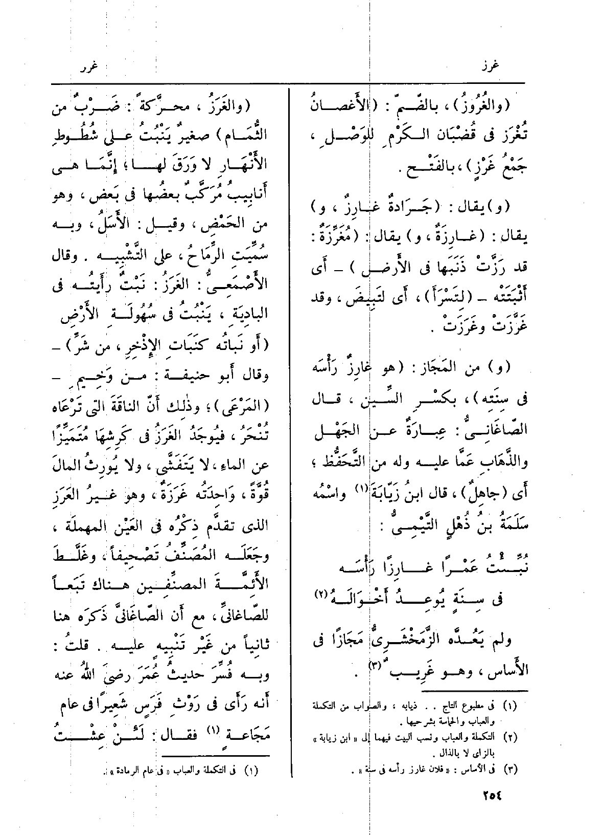 وَلم يعُدَّه الزَّمَخْشَرِيّ مَجازاً فِي الأساس، وَهُوَ غريبٌ. والغَرَزُ، مُحرّكةً: ضَرْبٌ من الثُّمام صغيرٌ يَنْبُتُ على شُطوطِ الأنهارِ لَا وَرَقَ لَهَا، إنّما هِيَ أنابيبُ مُرَكَّبٌ بعضُها فَوق بعض، وَهُوَ من الحَمْض، وَقيل: الأَسَل، وَبِه سُمِّيت الرِّماح، على التَّشْبِيه. وَقَالَ الأَصْمَعِيّ: الغَرَزُ: نَبْتٌ رأيتُه فِي الْبَادِيَة، ينبتُ فِي سُهولةِ الأَرْض أَو نباتُه كنباتِ الإذْخِر، من شَرِّ وَقَالَ أَبُو حنيفَة: من وَخيمِ المَرعى وَذَلِكَ أنّ الناقةَ الَّتِي تَرْعَاه تُنحَر، فيوجَد الغَرَزُ فِي كَرِشِها مُتمَيِّزاً عَن المَاء، لَا يتفَشَّى، وَلَا يُورِثُ المالَ قُوَّةً، واحدتُه غَرَزَةٌ، وَهُوَ غيرُ العَرَزِ الَّذِي تقدّم ذِكرُه فِي العَين المُهملَة. وَجَعَله المُصَنِّف تَصحيفاً، وغَلَّطَ الأئمّةَ المُصَنِّفين هُنَاكَ تَبَعاً للصاغانيّ، مَعَ أَن الصَّاغانِيّ ذَكَرَه هُنَا ثَانِيًا من غير تَنْبِيه عَلَيْهِ. قلتُ: وَبِه فُسِّر حديثُ عمر رَضِي الله عَنهُ أَنه رأى فِي رَوْثِ فرَسٍ شَعيراً فِي عَام مَجاعةٍ فَقَالَ: لئِنْ عِشْت