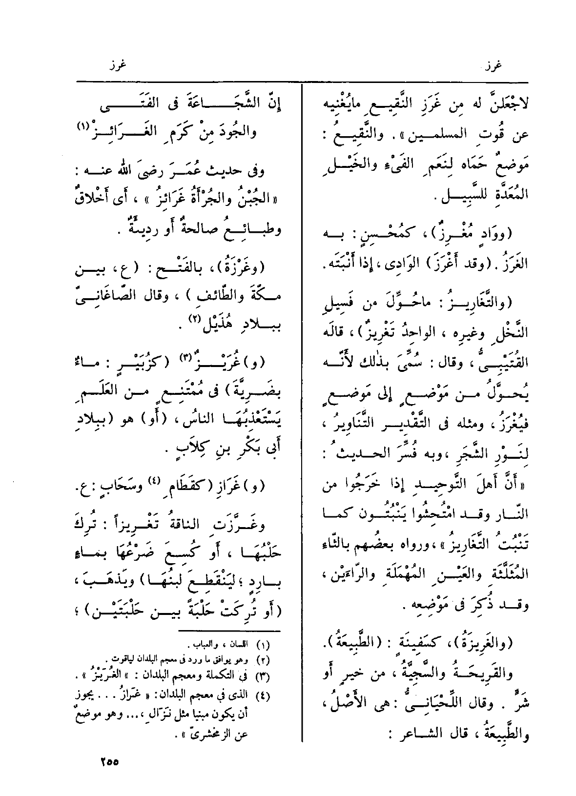وغَرْزَةُ، بالفَتْح: ع، بَين مكّةَ والطائف، وَقَالَ الصَّاغانِيّ ببلادِ هُذَيْل. غُرَيْز كزُبَيْر: ماءٌ بضَرِيَّةَ فِي مُمتَنِعٍ من العَلَمِ يَسْتَعذِبُها الناسُ، أَو هُوَ ببلادِ أبي بكرِ بنِ كلابٍ. غَرازِ كَقَطَامِ وَسَحَابٍ: ع. وغَرَّزَتِ الناقةُ تَغْرِيزاً: تُرِكَ حَلْبُها، أَو كُسِعَ ضَرْعُها بماءٍ باردٍ، لينقَطِعَ لبَنُها ويذهبَ، أَو تُرِكَت حَلْبَةً بَين حلبَتَيْن