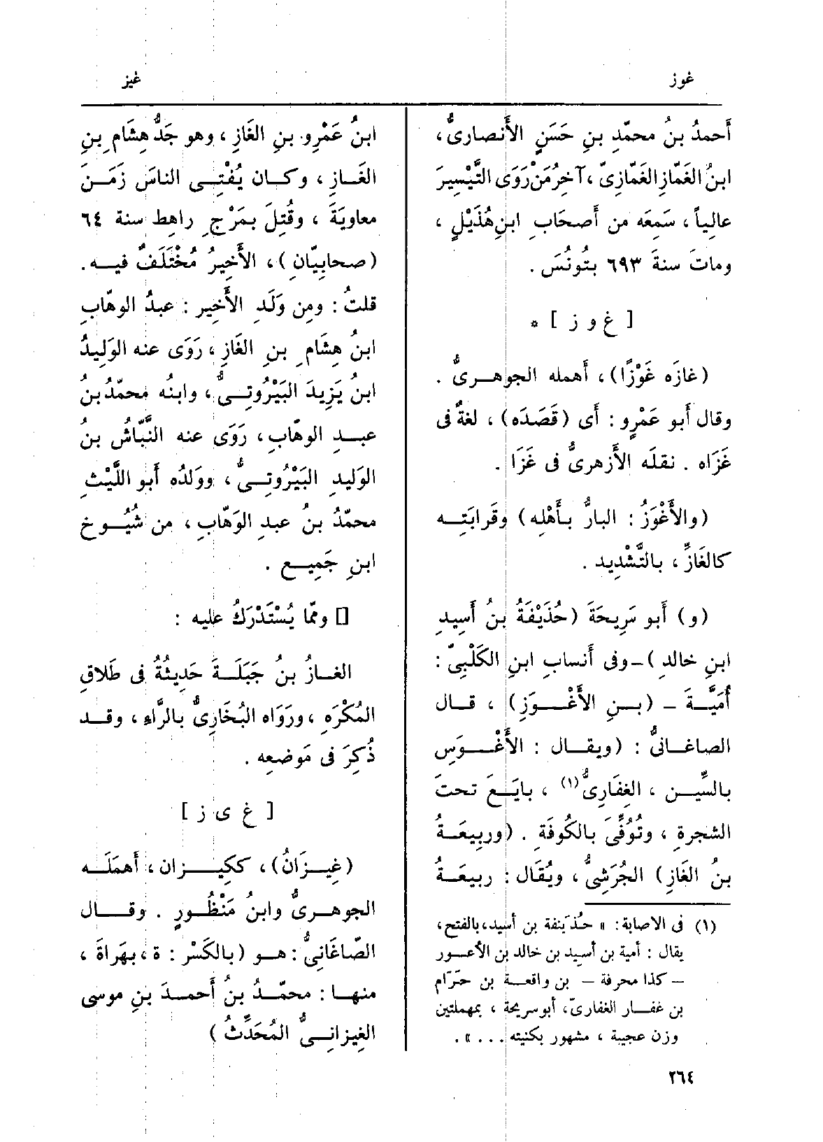 {غازَه} غَوْزَاً، أهمله الجَوْهَرِيّ. وَقَالَ أَبُو عمروٍ: أَي قَصَدَه، لغةٌ فِي غَزاه، نَقله الأَزْهَرِيّ فِي غَزا. {والأَغْوَز: البارُّ بأهلِه وقَرابَتِه كالغازِّ، بِالتَّشْدِيدِ. أَبُو مَريحَةَ حُذَيْفةُ بنُ أَسِيدِ بنِ خالدِ وَفِي أَنْسَاب ابنِ الكلبيّ: أُميّة بنِ} الأَغْوَزِ، قَالَ الصَّاغانِيّ: وَيُقَال: الأَغْوَسِ بِالسِّين، الغِفاريّ، بايعَ تحتَ الشجرةِ، وتُوفِّيَ بالكُوفة. ورَبيعةُ بنُ الغازِ الجُرَشيُّ، وَيُقَال: ربيعةُ بنُ عَمْرِو بنِ {الغازِ، وَهُوَ جدُّ هشامِ بنِ الْغَاز، وَكَانَ يُفتي الناسَ زَمَنَ معاويةَ، وقُتِلَ بمَرجِ راهِط سنة صَحابِيَّان، الأخيرُ مُختَلَفٌ فِيهِ، قلتُ: وَمن ولَدِ الْأَخير: عبدُ الوهّابِ بنُ هشامِ بنِ الغازِ، روى عَنهُ الوليدُ بنُ يزيدَ البَيْروتيّ، وابنُه مُحَمَّد بن عبدِ الوهّاب، روى عَنهُ النَّبَّاشُ بنُ الوليدِ البَيْروتيّ، وولَدُه أَبُو الليثِ مُحَمَّد بنُ عبد الوهّاب، من شيوخِ ابنِ جَميع. ومِمّا يُسْتَدْرَك عَلَيْهِ:} الغازُ بنُ جَبَلَةَ حَديثُهُ فِي طَلاقِ المُكرَه، وَرَوَاهُ البُخاريُّ بالراء، وَقد ذُكِرَ فِي مَوْضِعه.