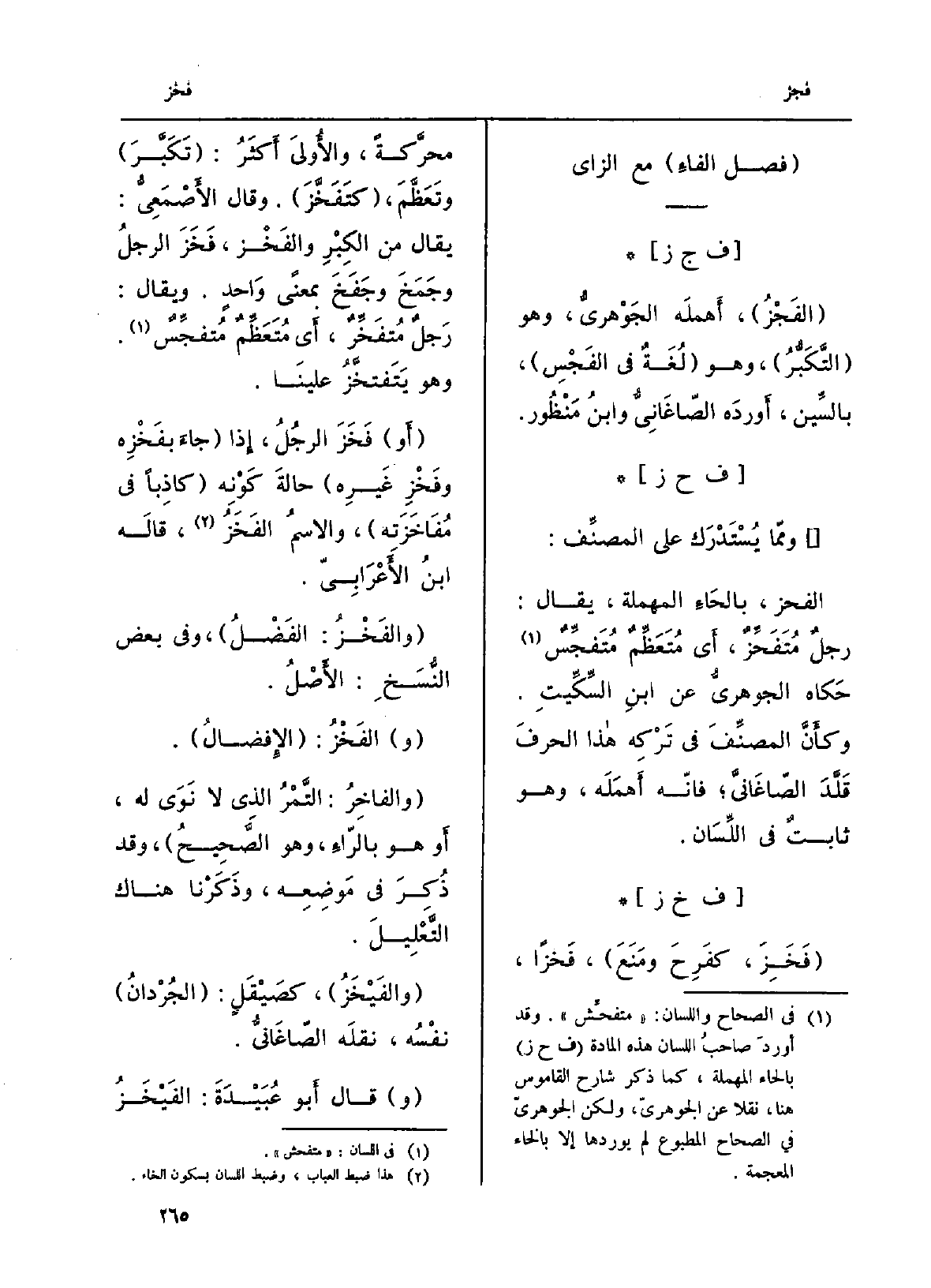 الفَجْز، أهمله الجَوْهَرِيّ، وَهُوَ التَّكَبُّرُ، وَهُوَ لغةٌ فِي الفَجْسِ، بالسِّين، أوردهُ الصَّاغانِيّ وابنُ مَنْظُور.