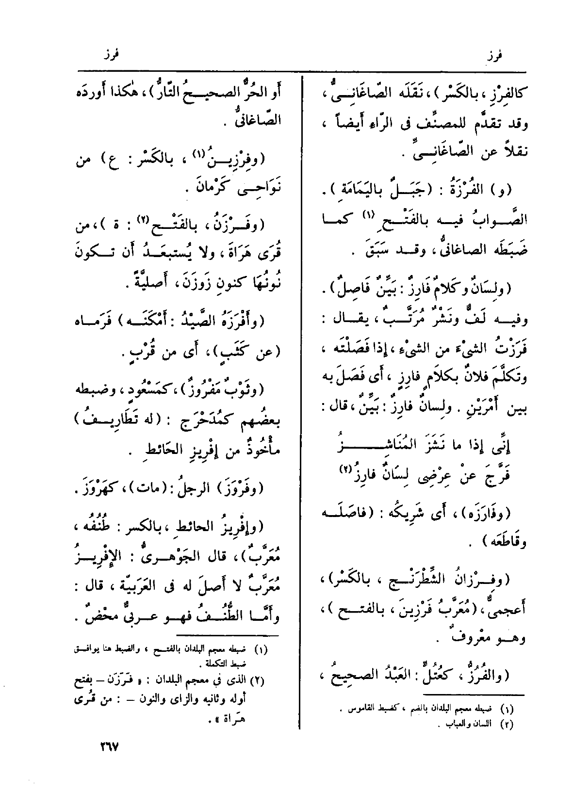 وفارَزَهُ، أَي شَريكُه: فاصَلَه وقاطَعَه. وفِرْزَانُ الشِّطْرَنْجِ، بالكَسر، أَعجَمِيٌّ، معَرَّبُ فَرْزِيْنَ، بِالْفَتْح، وَهُوَ مَعروفٌ. والفُرُزُّ، كعُتُلٍّ: العَبْدُ الصَّحيحُ، أَو الحُرُّ الصَّحِيح التّارُّ، هَكَذَا أَوردَه الصَّاغانِيّ. وفِرْزِينُ، بالكَسر: ع، من نواحِي كِرْمانَ. وفَرْزَنُ، بِالْفَتْح: ة، من قُرَى هَراةَ وَلَا يُستبعدُ أَن تكونَ نونُها كنُونِ زَوزَنَ، أَصلِيَّةً. وأَفْرَزَهٌ الصَّيْدُ: أَمكنَه فَرَمَاهُ عَن كثَبٍ، أَي من قربٍ. وثوبٌ مَفْرُوزٌ، كمَسْعُودٍ، وضبطَه بعضُهم كمُدَحْرَج: لَهُ تَطَارِيفُ مأْخُوذٌ من إفريزِ الحائطِ. وفَرْوَزَ الرَّجُلُ: ماتَ، كهَرْوَزَ. وإفريزُ الحائطِ، بالكَسر: طُنُفُه، مُعَرَّبٌ، قَالَ الجَوْهَرِيّ: الإفريزُ مُعَرَّبٌ لَا أَصلَ لَهُ فِي العربيَّة، قَالَ: وأَمّا الطُّنُفُ فَهُوَ عرَبِيٌّ مَحْضٌ.