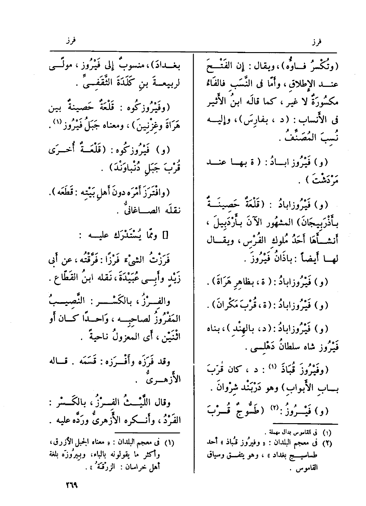 وتُكْسَر فاؤُه، وَيُقَال: إنَّ الفتحَ عندَ الإطْلاقِ، وَأما فِي النَّسَبِ فالفاءُ مَكسورَةٌ لَا غير، كَمَا قَالَه ابْن الأَثير فِي الأَنساب: د، بفارِسَ، وَإِلَيْهِ نُسِبَ المُصَنِّفُ. فَيْرُوزابادُ: ة بهَا عِنْد مَرْدَشْتَ. فَيْرُوزابادُ: قلْعَةٌ حَصينَةٌ بأَذْرَبِيجانَ الْمَشْهُور الْآن بأَرْدَبِيلَ، أَنشأَها أحَدُ مُلُوك الفُرْسِ، وَيُقَال لَهَا أَيضاً: بَاذَانُ فَيْرُوزَ. فَيْروزابادُ: ة، بظاهِر هَرَاةَ. فَيْروزابادُ: ة، قُرْبَ مَكْرانَ. فَيْروزابادُ: د، بِالْهِنْدِ، بناه فَيروز شاه سُلطانُ دَهْلِي. وفَيْرُوزَ قُباذَ: د، كَانَ قُربَ بَاب الأَبواب وَهُوَ دَرْبَنْد شِرْوانَ. فَيْرُوزُ: طَسُّوجٌ قُرْبَ بغدادَ، مَنسوبٌ إِلَى فَيروز، مَولىً لرَبيعةَ بنِ كلَدَةَ الثَّقَفِيِّ. وفَيْروز كُوه: قلعةٌ حصينةٌ بينَ هَراةَ وغِزْنينَ، وَمَعْنَاهُ جَبَل فَيْرُوز. فَيْروزكُوه: قلعةٌ أُخرى قُرْبَ جبَلِ دُنْباوَنْدَ. وافْتَرَزَ أَمْرَهُ دونَ أَهل بيتِه: قطعَه. نَقله الصَّاغانِيّ. وَمِمَّا يستدرَكُ عَلَيْهِ: فَرَزْتُ الشيءَ فَرْزاً: فَرَّقْتُه، عَن أَبي زيدٍ وأَبي عُبيدةَ، نَقله عَن ابْن القطّاع. والفِرْزُ، بالكَسْر: النَّصيبُ المَفروزُ لصاحبِه، وَاحِدًا كَانَ أَو اثْنَيْنِ، أَي المَعزولُ نَاحيَة. وَقد فَرَزَه وأَفْرَزَه: قسمَه. قَالَه الأَزْهَرِيّ. وَقَالَ اللَّيْث: الفِرْزُ، بالكَسْر: الفَرْدُ، وأَنكرَه الأَزْهَرِيُّ وردَّه عَلَيْهِ.