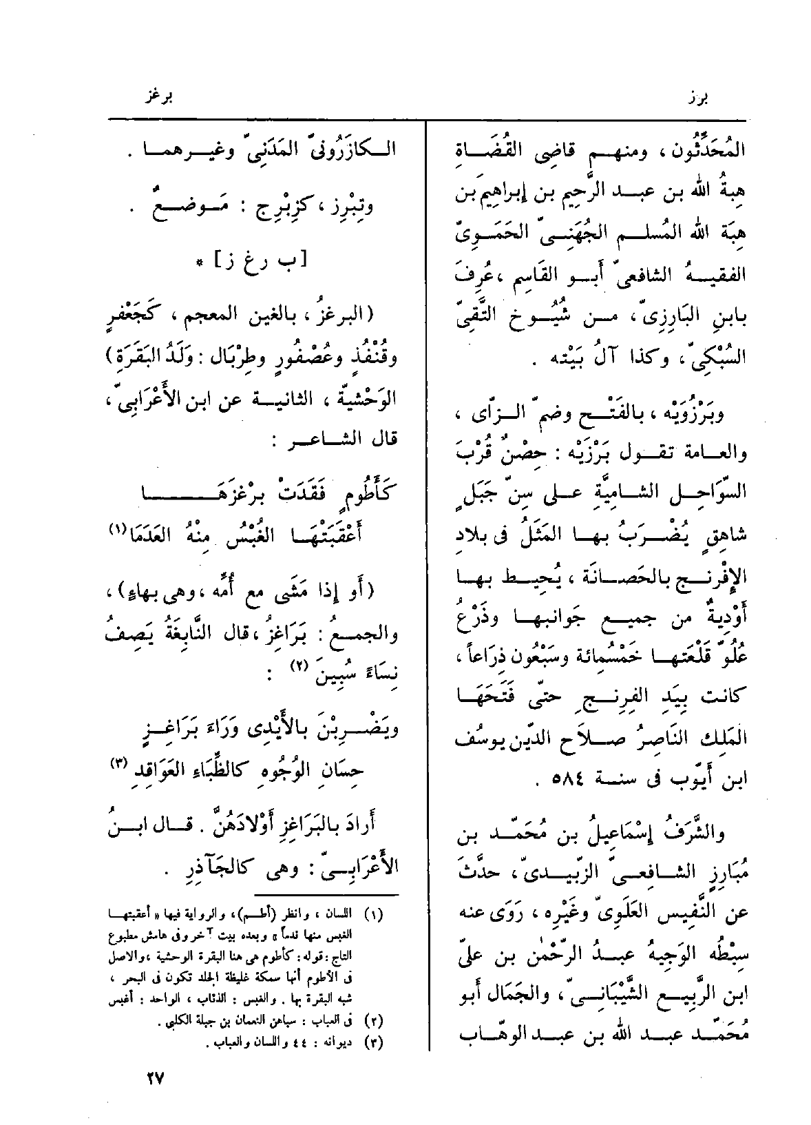 المُحدِّثون، وَمِنْهُم قَاضِي القُضاة هِبَةُ الله بن عبد الرَّحِيم بن إِبْرَاهِيم بن هِبَة الله المُسلم الجُهَنِيّ الحَمَويّ الفقيهُ الشافعيّ أَبُو الْقَاسِم، عُرِفَ بابنِ البارِزِيّ، من شُيُوخ التّقِيّ السُّبْكيّ، وَكَذَا آلُ بيتِه. وبَرْزَوَيْه، بِالْفَتْح وضمّ الزَّاي، والعامّة تقولُ بَرْزَيْه: حِصنٌ قربَ السواحِلَ الشاميّةِ على سِنِّ جبلٍ شاهقٍ يُضرَبُ بهَا المثَلُ فِي بلادِ الإفْرَنْج بالحَصَانة، يُحيط بهَا أَوْدِيةٌ من جَمِيع جوانبها وذَرْعُ عُلُوّ قَلْعَتِها خَمْسمِائَة وسَبعون ذِراعاً، كَانَت بيد الفِرِنجِ حَتَّى فَتَحَها الملِك النَّاصِر صَلَاح الدّين يُوسُف بن)