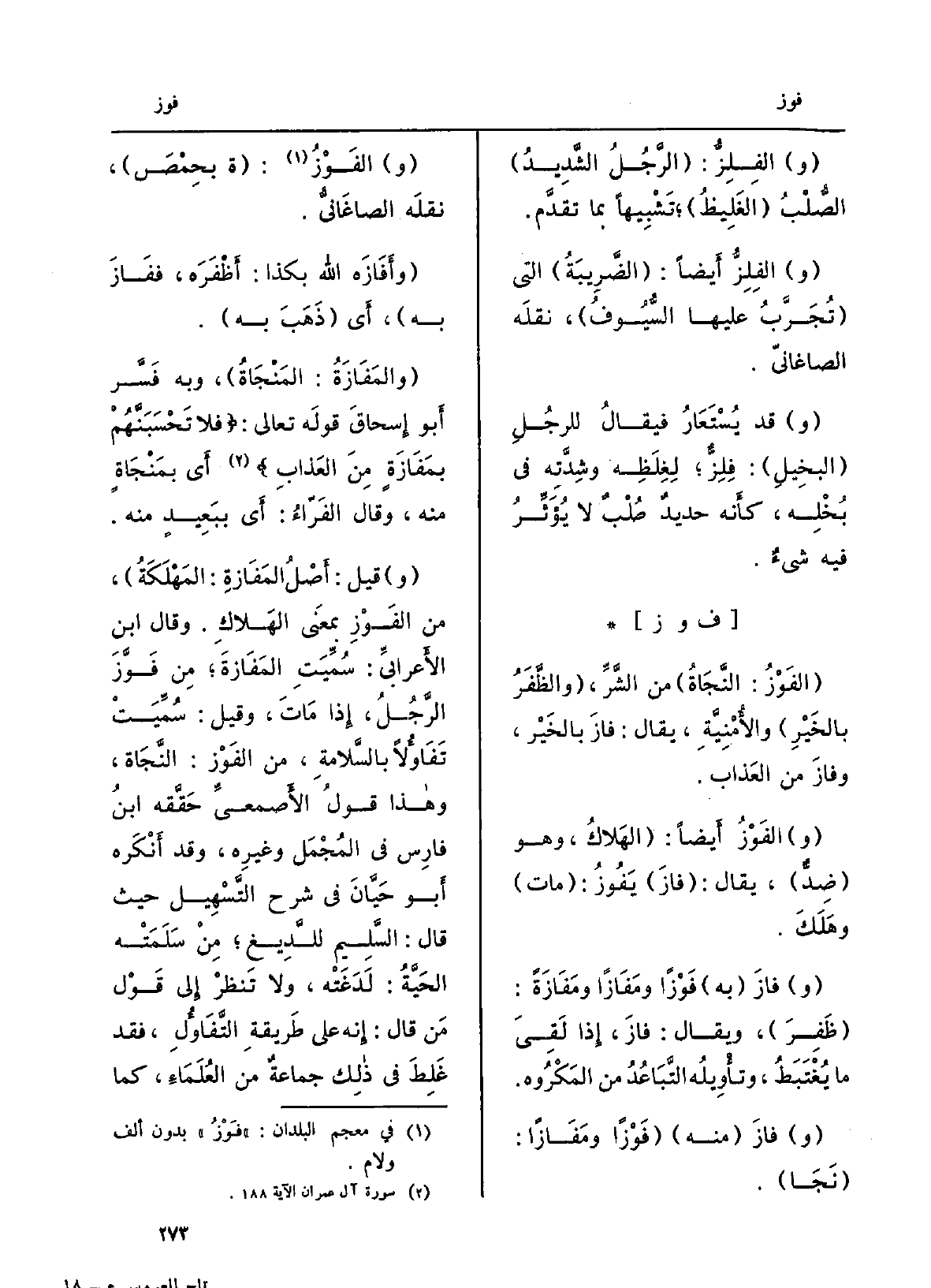 {الفَوْزُ: النَّجاةُ من الشَّرِّ، والظَّفرُ بِالْخَيرِ والأُمنية، يُقَال:} فازَ بِالْخَيرِ، وفازَ من العذابِ. {الفَوْزُ أَيضاً: الهَلاكُ، وَهُوَ ضِدُّ، يُقال:} فازَ {يَفُوزُ: ماتَ وهلَكَ. فازَ بِهِ} فَوْزاً {ومَفازاً} ومَفازَةً: ظَفِرَ، وَيُقَال: فازَ، إِذا لَقِيَ مَا يُغْتَبَطُ، وتأْويلُه التَّباعُد من المَكروه. فازَ مِنْهُ {فَوْزاً} ومَفازاً: نَجا. الفَوْزُ: ة، بحِمْصَ، نَقله الصَّاغانِيّ. {وأَفازَه الله بِكَذَا: أَظْفَرَه، ففازَ بِهِ، أَي ذهبَ بِهِ.} المَفازَةُ: المَنْجاةُ، وَبِه فَسَّرَ أَبو إسحاقَ قولَه تَعَالَى: فَلَا تَحْسَبَنَّهُمْ {بِمَفازَةٍ مِنَ العَذابِ أَي بمَنْجاةٍ مِنْهُ، وَقَالَ الفرَّاءُ: أَي ببعيدٍ مِنْهُ. قيل: أَصْلُ} المَفازَةِ: المَهْلَكَةُ، من {الفَوزِ بِمَعْنى الهَلاكِ. وَقَالَ ابْن الأَعرابيِّ: سُمِّيَتِ المَفازَةُ، من} فوَّزَ الرَّجلُ، إِذا ماتَ، وَقيل: سُمِّيَتْ تَفاؤُلاً بالسَّلامة، من الفَوز: النَّجاة، وَهَذَا قَول الأَصمعيّ حقَّقه ابنُ فَارس فِي المُجمَل وَغَيره، وَقد أَنكرَه أَبو حيَّانَ فِي شرح التَّسهيل حَيْثُ قَالَ: السَّليمُ للَّدِيغ، مِنْ سَلَمَتْه الحَيَّةُ: لدَغَتْه، وَلَا تَنْظُر إِلَى قَول من قَالَ: إنَّه على طَريقَة التَّفاؤُلِ، فقد غَلِطَ فِي ذَلِك جماعةٌ من العلماءِ، كَمَا